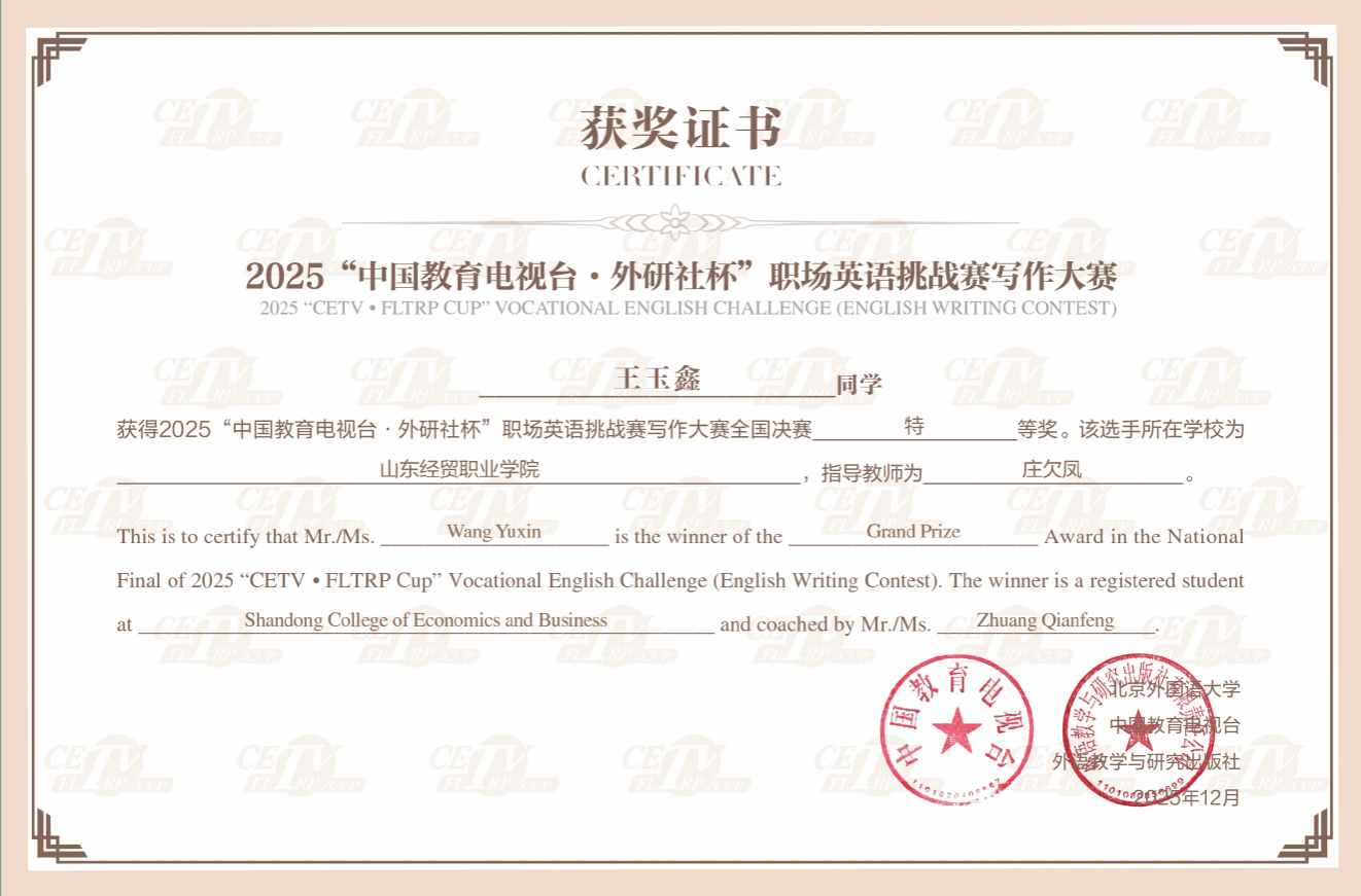 学院学生获2025“中国教育电视台·外研社杯”职场英语挑战赛写作大赛国赛特等奖