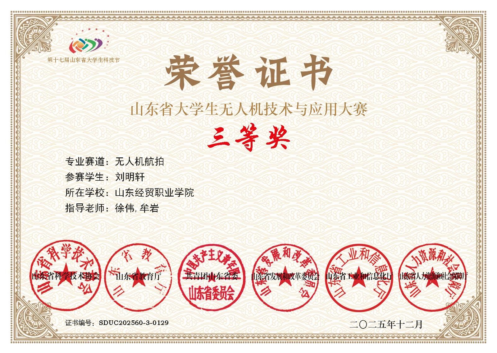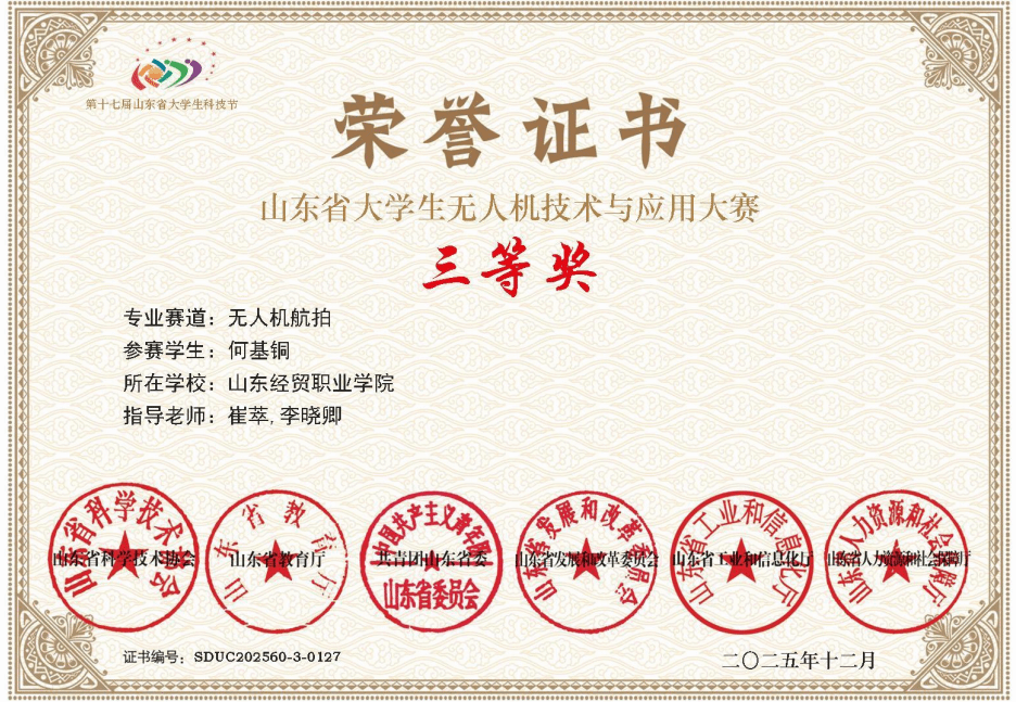 近日,第十七届山东省大学生科技节无人机技术与应用大赛无人机航拍赛道在山东大学威海校区开赛,学院无人机应用技术专业负责人徐伟带领学生刘明轩、王栋、赵士坦、何基铜首次参加该赛事,取得四项三等奖的优秀成绩。