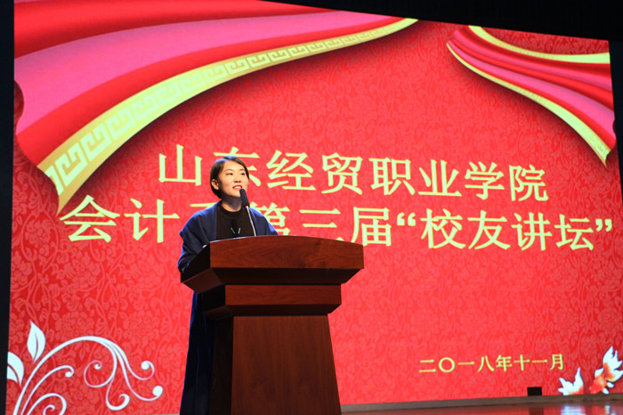 潍坊恒铭会计事务所、山东臻融股权投资管理有限公司总经理王文茜结合自己成长的经历和创业的艰辛,告诫同学们,人生要懂得断舍离,不要把时间浪费在不必要的事情上,她鼓励同学们在校期间要常去图书馆,用书籍代替手机充实自己的生活,多考取资格证书,为将来走向社会打下坚实基础,她还亲切幽默的告诉同学们“学的越多赚得越多,学的越快赚得越快”。在就业和创业上她希望师弟师妹们一定要放低自己的身段,珍惜每一个就业机会和岗位,一定要团结同事,乐于助人,脚踏实地干好本职工作,虚心向前辈和同事学习,不断积累工作经验和行业知识,为优质高效完成工作和将来自己创业打下坚实基础。