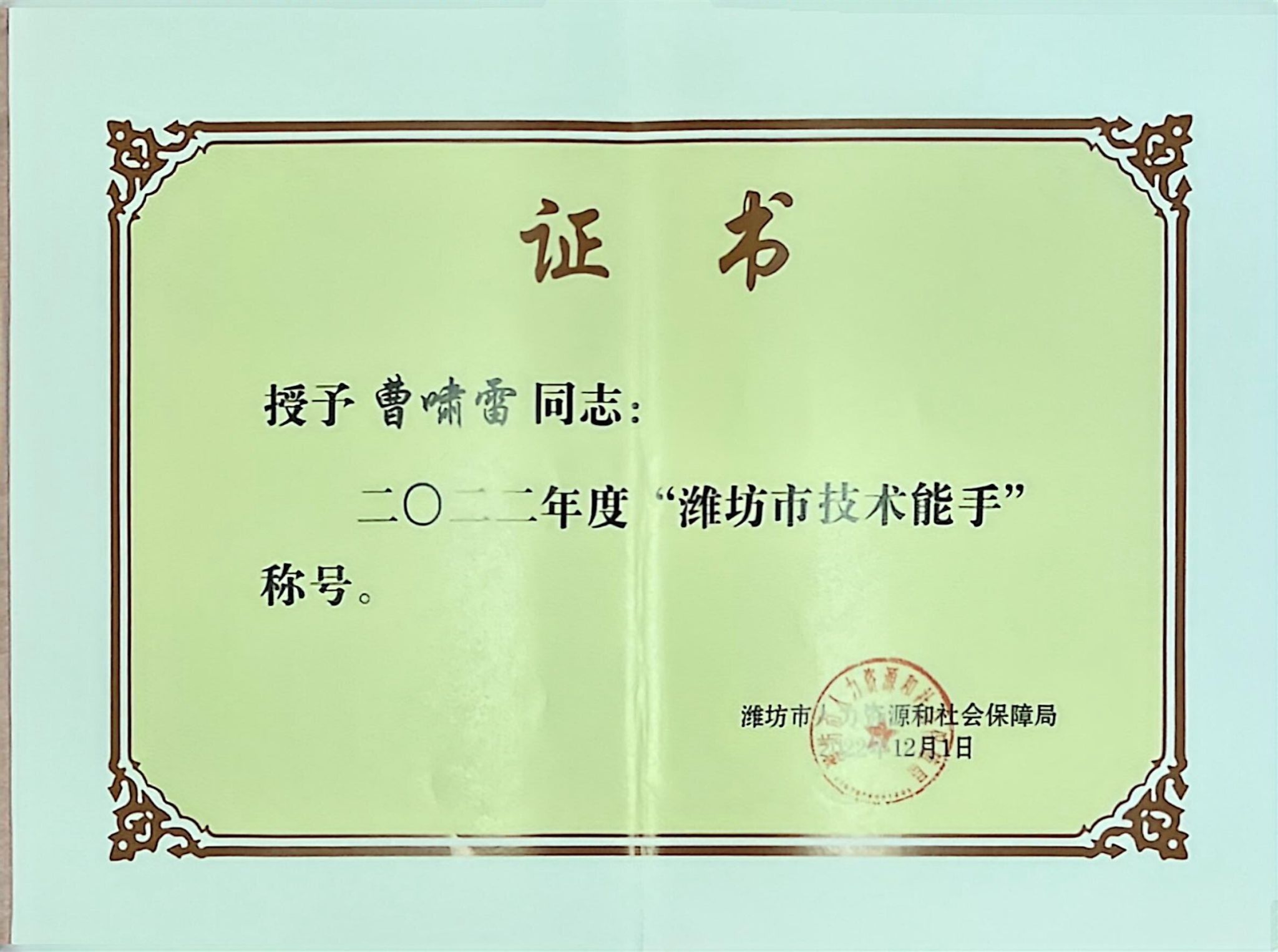 在日常的教学工作之余,还担任电气自动化技术专业技能大赛的指导教师,指导学生参加了2022年全国行业职业技能竞赛,学生获得第一名,获得金牌指导教师称号;本人参加山东省“技能兴鲁”职业技能大赛,获职工组第2名一等奖;参加潍坊市职业技能竞赛获第一名一等奖,并获潍坊市技术能手荣誉称号,同时还获得潍坊高新区首席技师荣誉称号。2023年,获“山东省技术能手”荣誉称号。2024年,获“山东省技术技能大师”荣誉称号。
