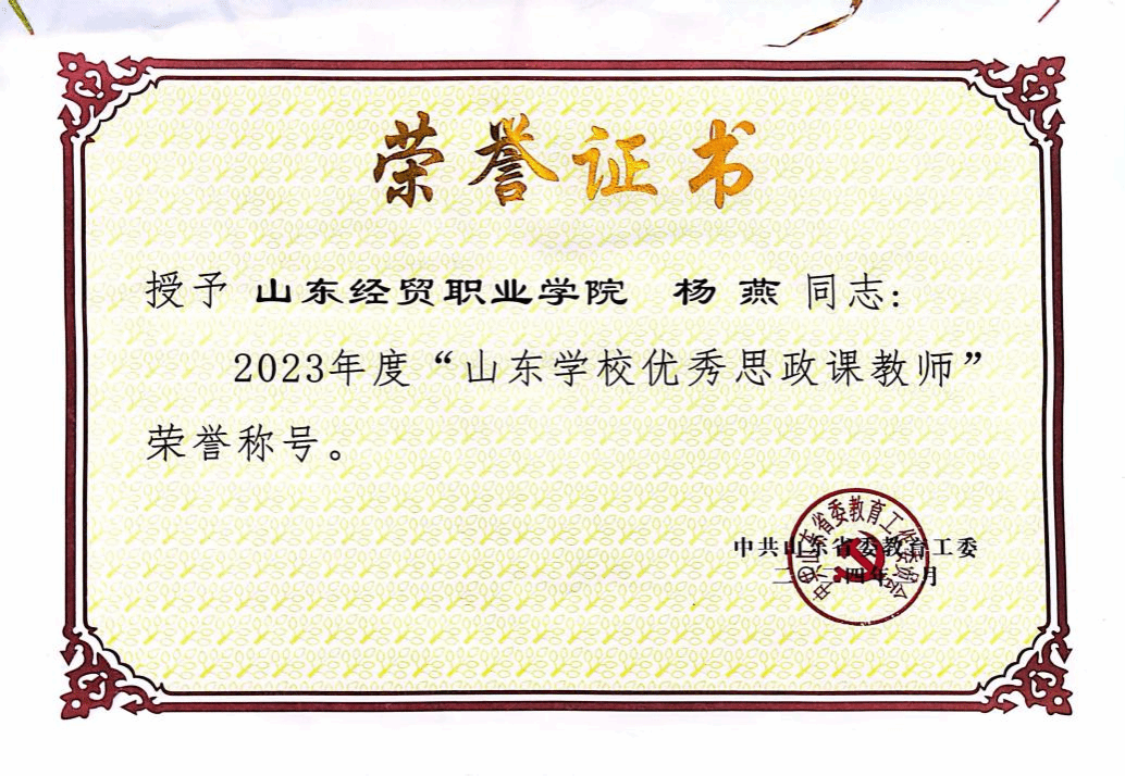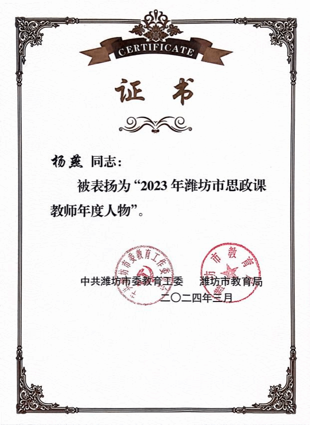 她先后获评潍坊市道德模范、山东好人、中国好人提名奖等荣誉,多次被评为学院优秀共产党员、学院优秀教师。23年初心不改,杨燕用扎实的教学功底、创新的育人理念、无私的奉献精神,在高职思政教育的沃土上默默耕耘,展现了新时代高校思政课教师的良好风貌。
