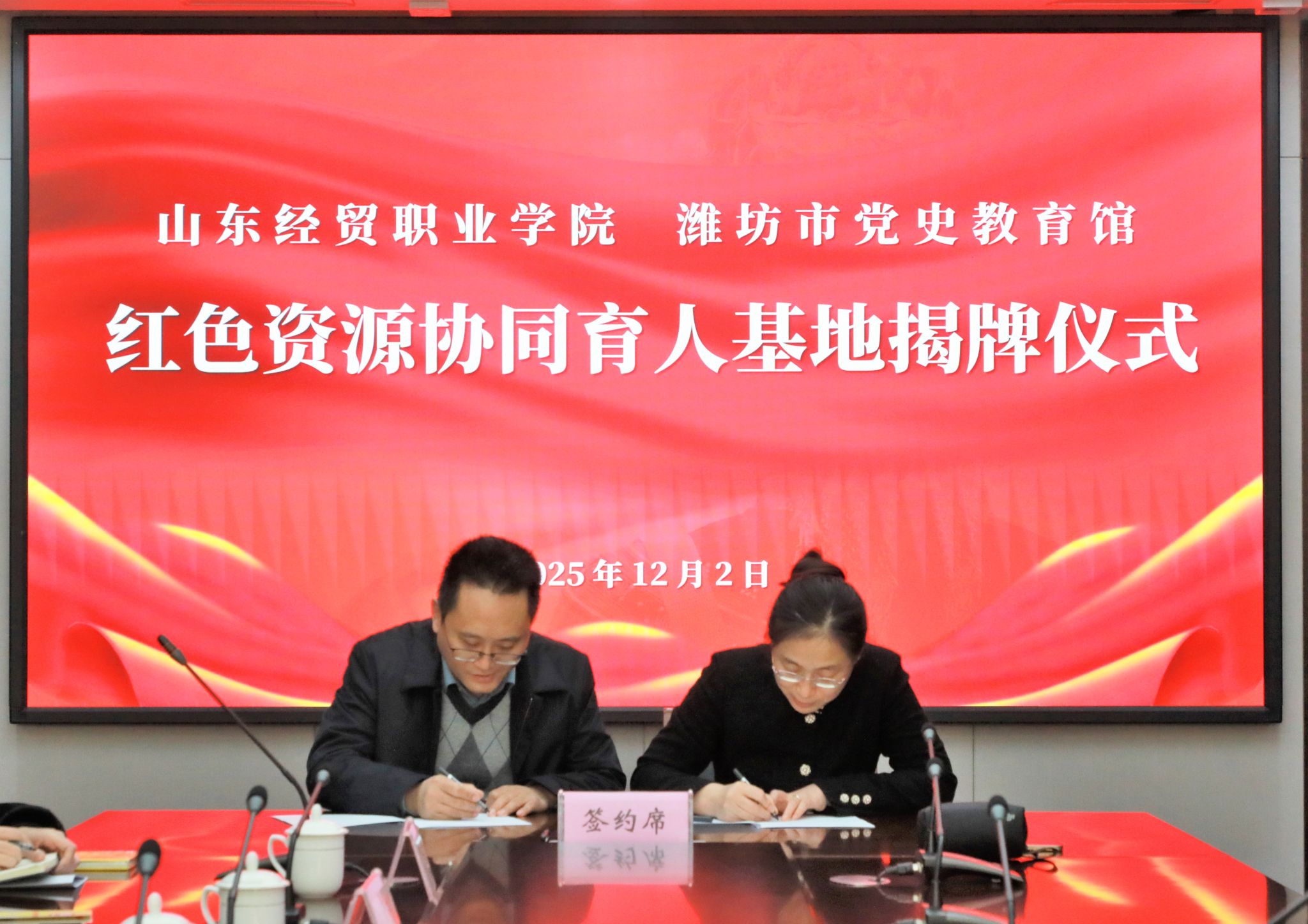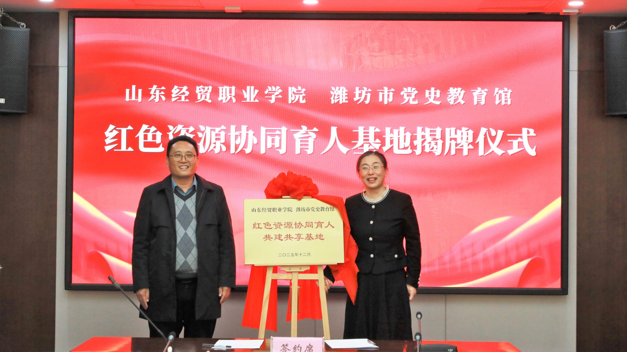 近日,学院与潍坊市党史教育馆签订共建共享红色资源协同育人平台协议,共建共享“红色资源协同育人基地”。学院党委委员、副院长吕昌锋与潍坊市党史教育馆馆长杨伟香共同为“红色资源协同育人基地”揭牌。学院资产管理处处长刘光明参加相关活动。