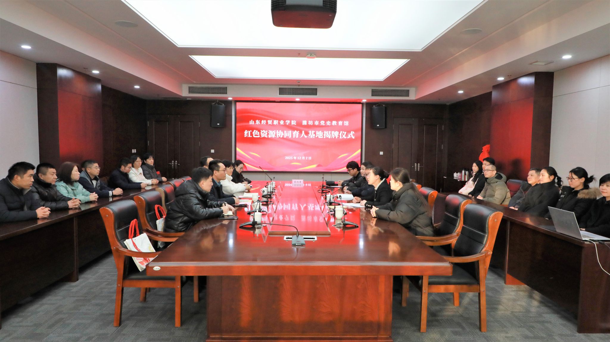 杨伟香介绍了潍坊市党史教育馆基本情况。她指出,党史教育馆拥有丰富的红色资源和专业的宣教团队,能够为学院思政教育、党性教育提供生动的实践课堂。她表示,“我们将全力支持这一合作平台建设,让红色资产真正成为铸魂育人的生动教材,成为全省全市校馆合作的典范”。