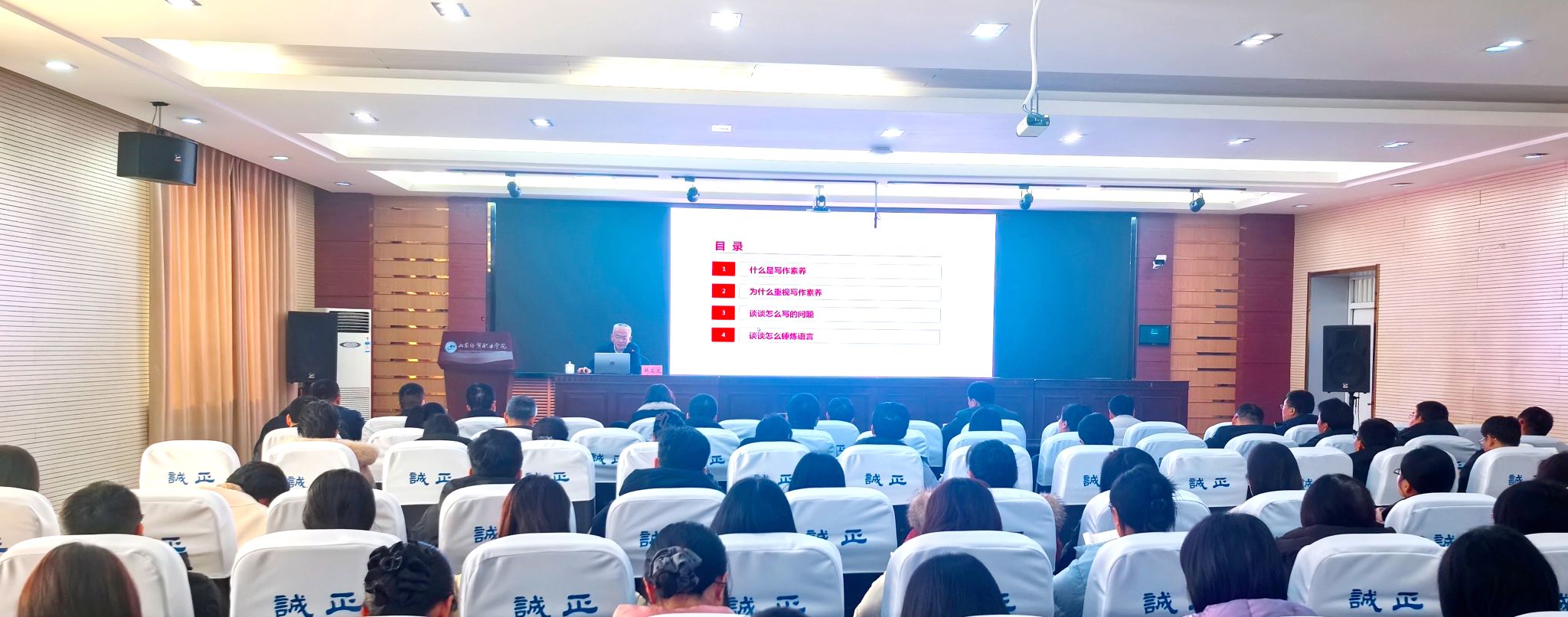 韩高文同志以其深厚的政策理论水平、过硬的业务能力和扎实的文字功底,结合其著述《 机关干部写作素养漫谈》, 围绕“什么是写作素养、为什么重视写作素养、怎么写的问题、怎么锤炼语言”这四个维度 展开 ,既有对写作素养内涵的深刻剖析,又有对写作重要性的高站位阐释;既系统讲解了“怎么写”的思维方式与实操步骤,又悉心传授了“怎么锤炼语言”的精细功夫。整场授课案例翔实、深入浅出,紧密联系工作实际,针对性强、含金量高 , 对学院办文工作极具指导意义。