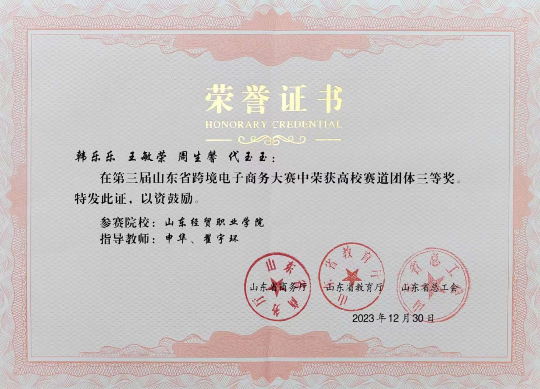 第三届山东省跨境电子商务大赛高校赛道及企业赛道决赛于2023年下半年,在山东外贸职业学院成功举办,经过选拔赛、排名赛和决赛历时5个月的激烈角逐,我院国际商务系跨境电子商务专业、国际经济与贸易专业以及商务英语专业8名同学组成的两支参赛队伍,分别荣获高校赛道团体三等奖。