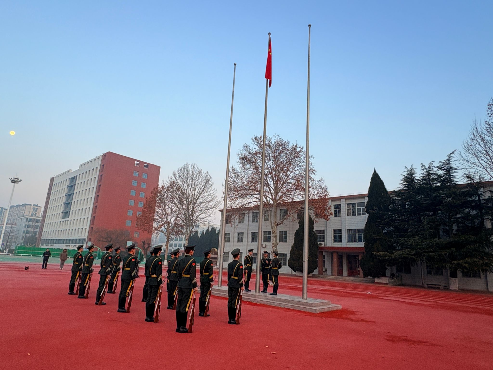 1月5日早晨,国际商务系全体学生与团学工作人员齐聚体育场,有序开展升旗仪式。国旗护卫队身着礼服、步伐铿锵,护送国旗昂首入场,雄壮的《义勇军进行曲》响彻校园,鲜艳的五星红旗迎着晨光冉冉升起。全体师生肃立行注目礼,心怀敬畏与赤诚,爱国之情油然而生。国旗下,学生代表的发言,更是将爱国情怀与专业使命紧密联结,尽显师生团结奋进的精神风貌。