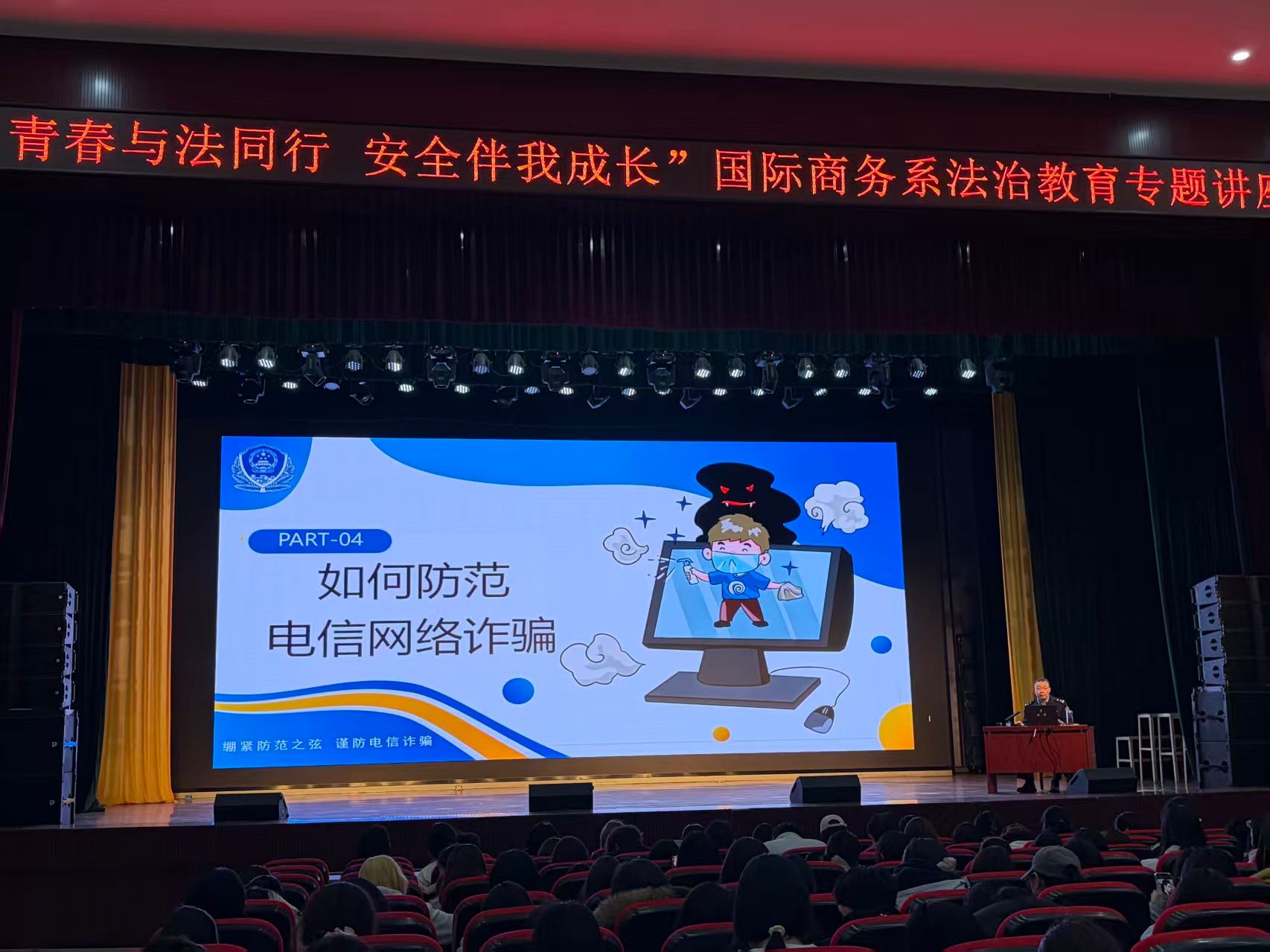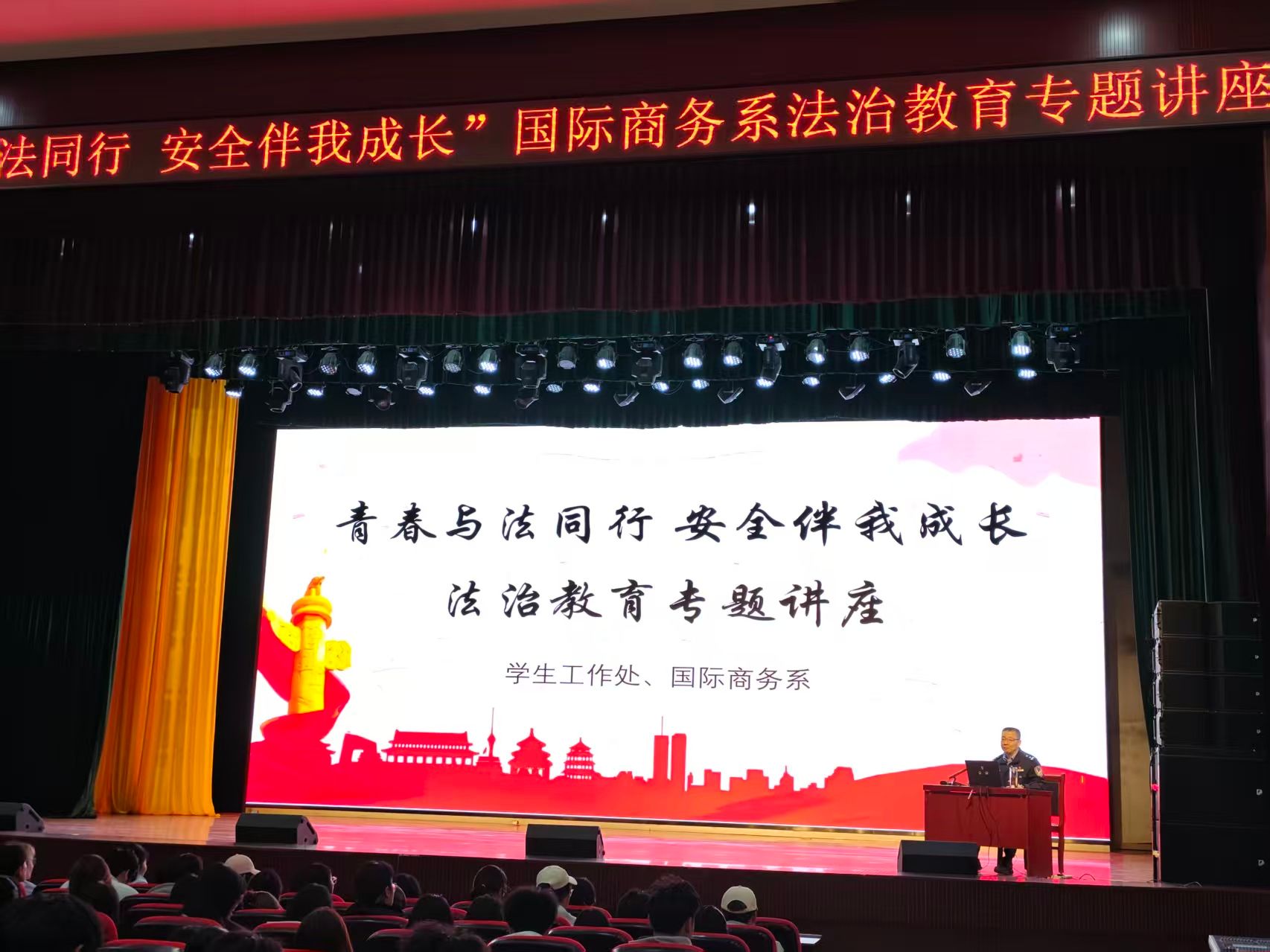 为深入推进学生法治教育工作,增强学生法律意识与法治观念,营造尊法、学法、守法、用法的校园氛围,2026 年 3 月 31 日,在学生工作处指导下,国际商务系顺利开展 “青春与法同行 安全伴我成长” 法治教育专题讲座。