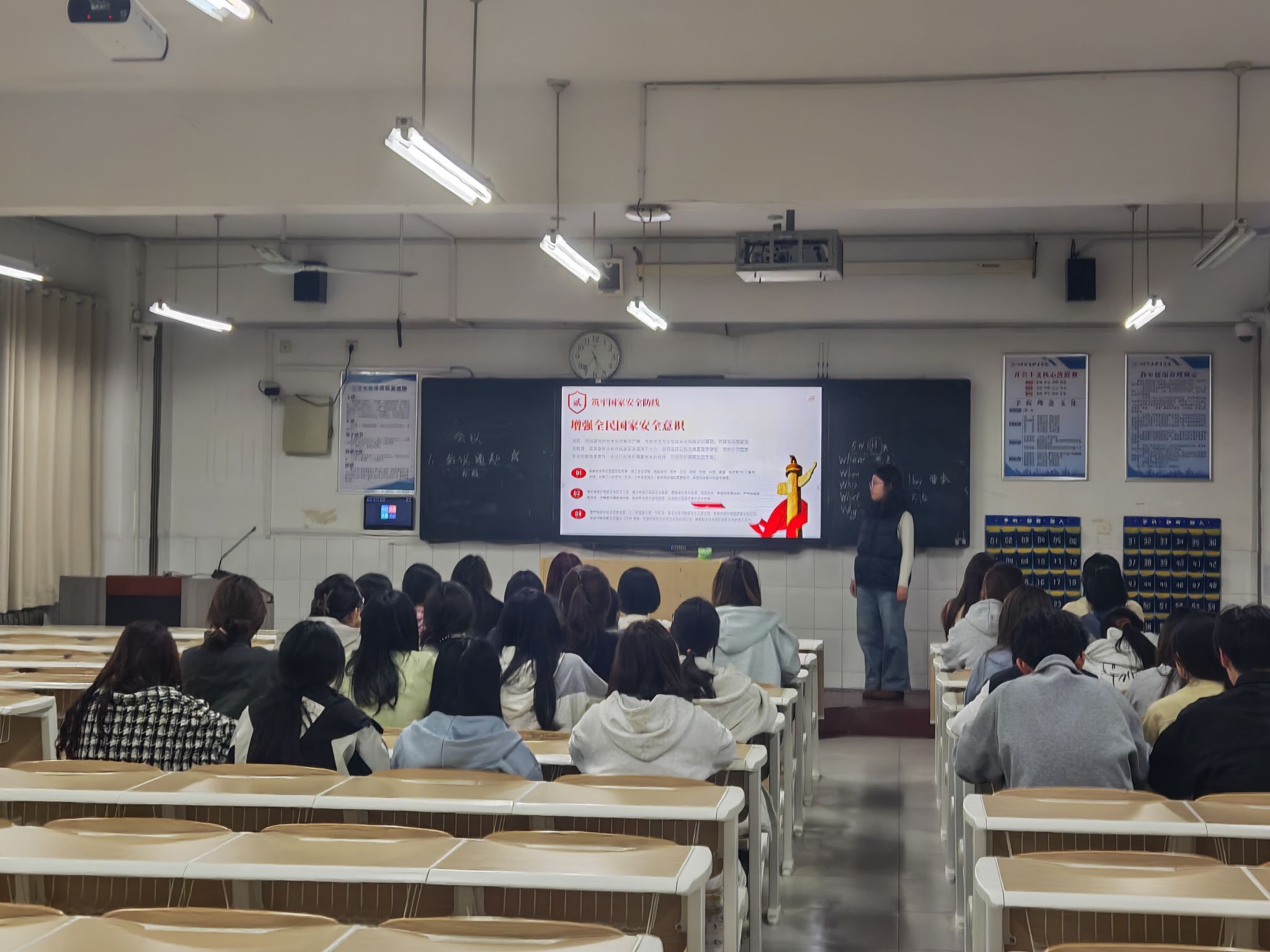 宣讲结束后,各班集中观看国家安全主题宣传片。影片以真实案例、情景再现的方式,直观展现网络泄密、信息泄露、文化渗透等安全风险的危害,解读《国家安全法》等相关规定,明确公民维护国家安全的法定义务。同学们认真观映、深入思考,在沉浸式体验中强化风险防范意识,深刻践行“国家安全,人人有责”的理念。