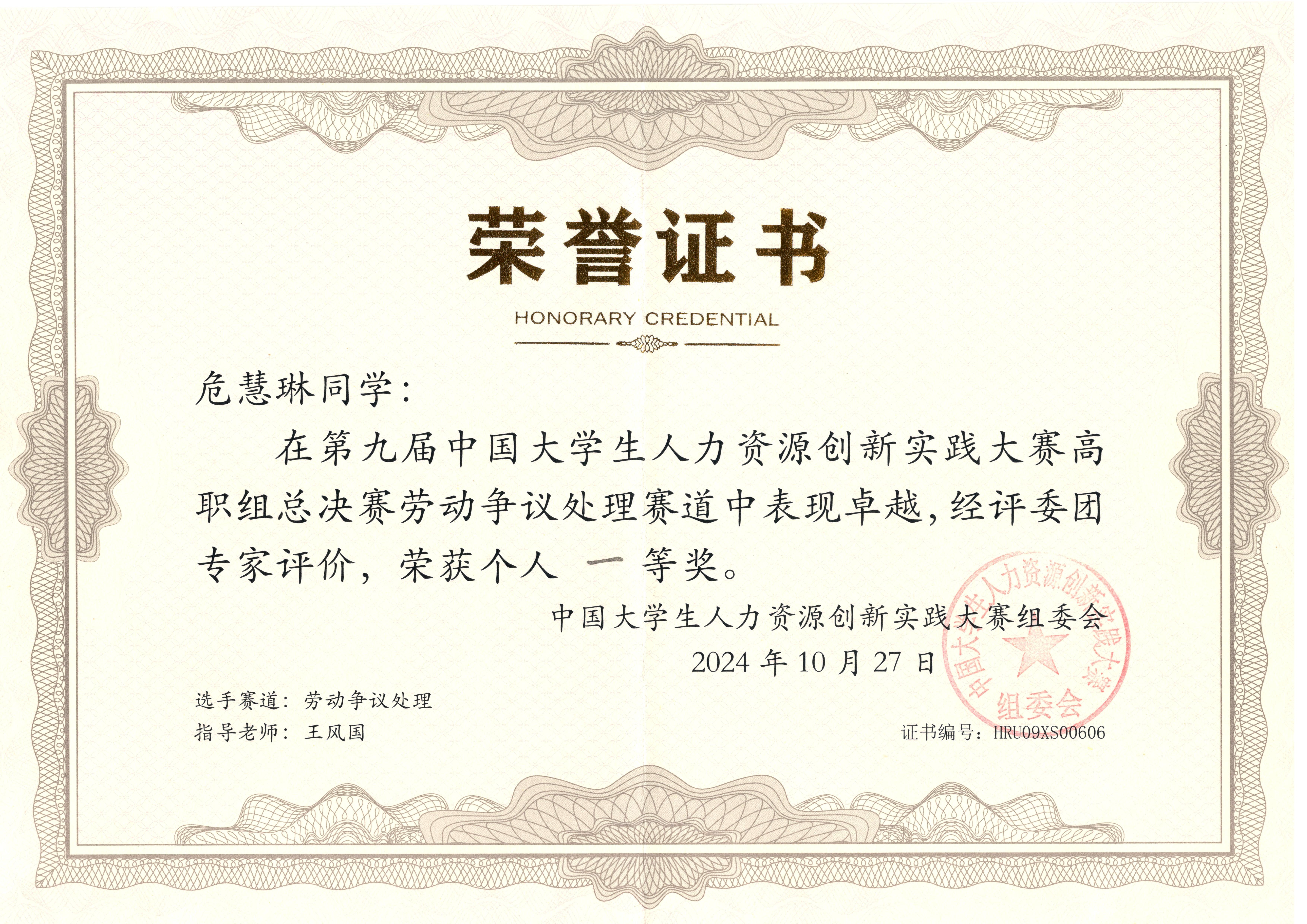 我院代表队以总排名获得团体特等奖,其中雷文祺获得案例分析赛道特等奖,危慧琳获得劳动争议处理赛道一等奖,付好获得职场实战赛道一等奖,刘文婷、井文程、张毓琦获得数字HR赛道一等奖、人力资源数字化管理(中级)职业技能等级证书,王坤获评优秀指导教师。