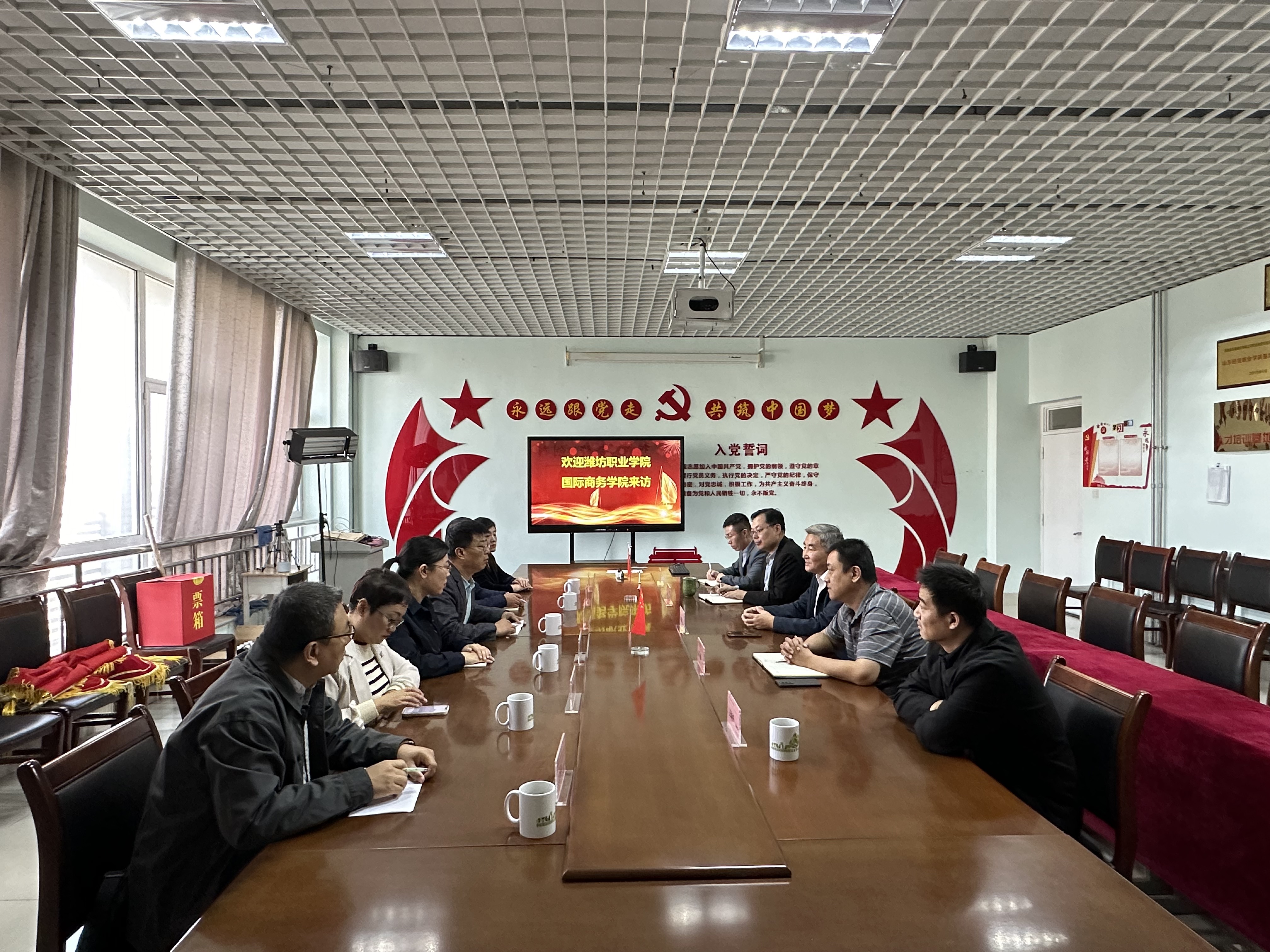 2023年10月24日,潍坊职业学院国际商务学院党总支副书记辛国庆,副院长黄言青、孙晓波一行六人来院交流座谈。工商管理系主任李宗顺,书记高巍,副主任高义丰,山东昊泓影视总经理王海宁参加交流座谈。