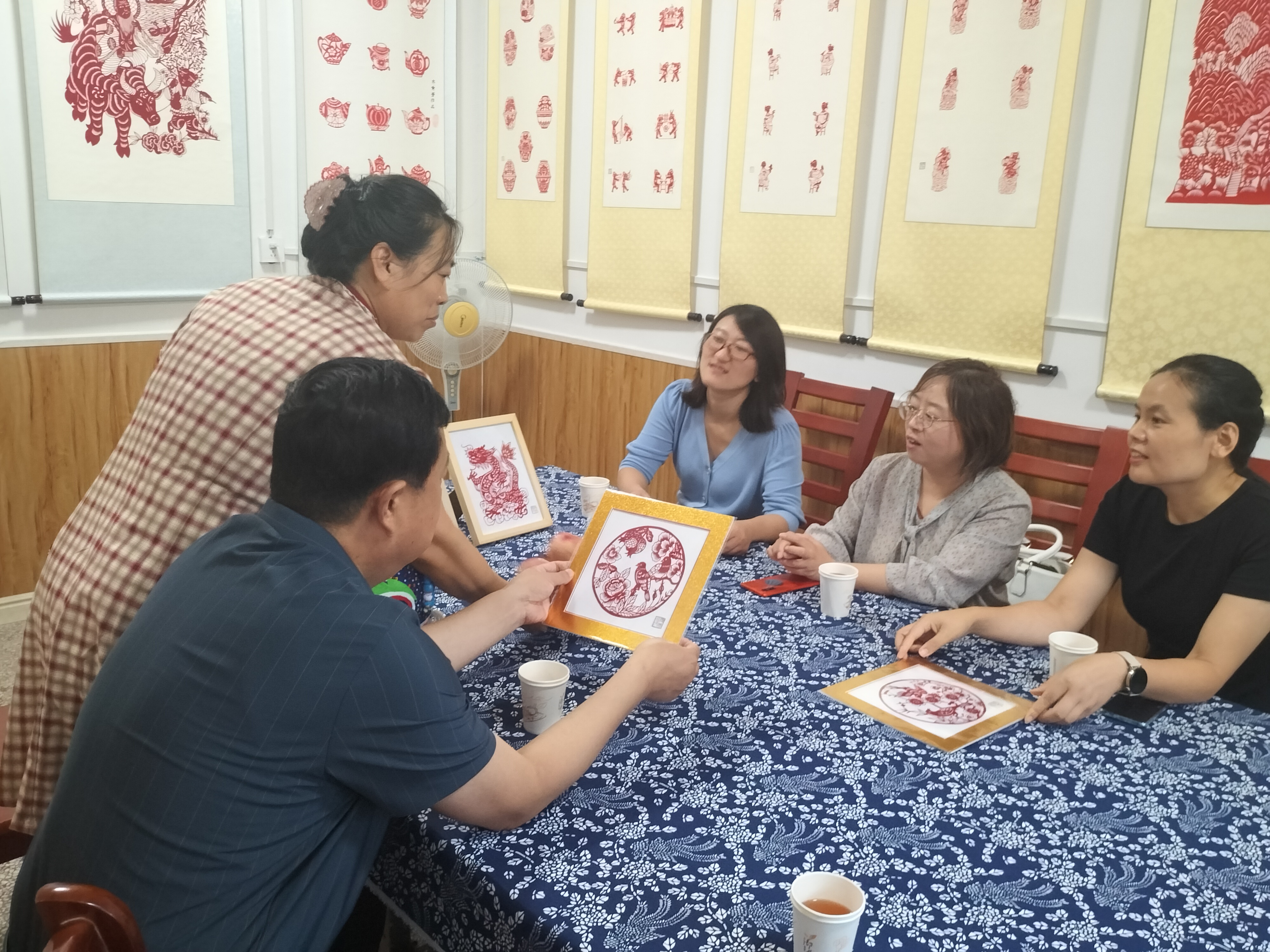 7月5日,学院科研处处长宋立温、工商管理系主任李宗顺、山东省职业教育技艺技能创新平台负责人李逾男教授与项目团队骨干成员一行6人到高密市考察交流纸文化非遗传承发展情况。在高密市文旅局党委委员、市公共文化服务中心党总支副书记展丽丽、高密市文旅局文化遗产科负责人、副研究馆员王金孝带领下,项目组一行到访了高密市王树花扑灰年画传习所、高密市齐氏艺术中心。