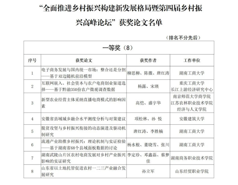 据悉,作为第四届乡村振兴高峰论坛的重头戏,本次征文由国家一级学会中国商业经济学会主办,南京师范大学、重庆工商大学、青岛理工大学、湖南商务职业技术学院等本专科院校96篇论文参与评选。经学会初审、专家复审等评审环节,共评出一等奖8篇、二等奖15篇、三等奖20篇。