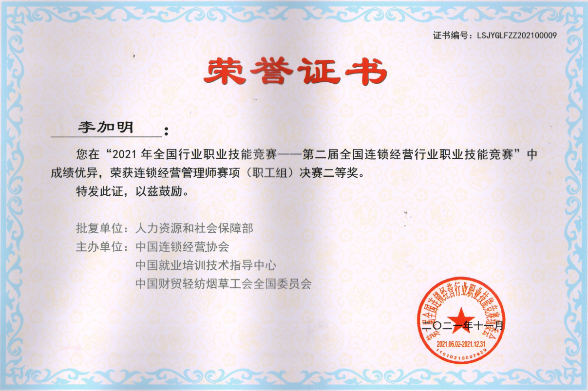 近日,在2021年全国行业职业技能竞赛——第二届全国连锁经营行业职业技能竞赛中,我院连锁经营与管理专业的师生表现出色,由王庆全、杨学艳老师指导的学生耿传嘉、王岩、白宝康三位同学获得连锁经营管理师赛项(学生组)国赛一等奖并获得CCFA颁发的6000元奖学金,李加明、徐鑫两位老师获得连锁经营管理师赛项(职工组)国赛二等奖。