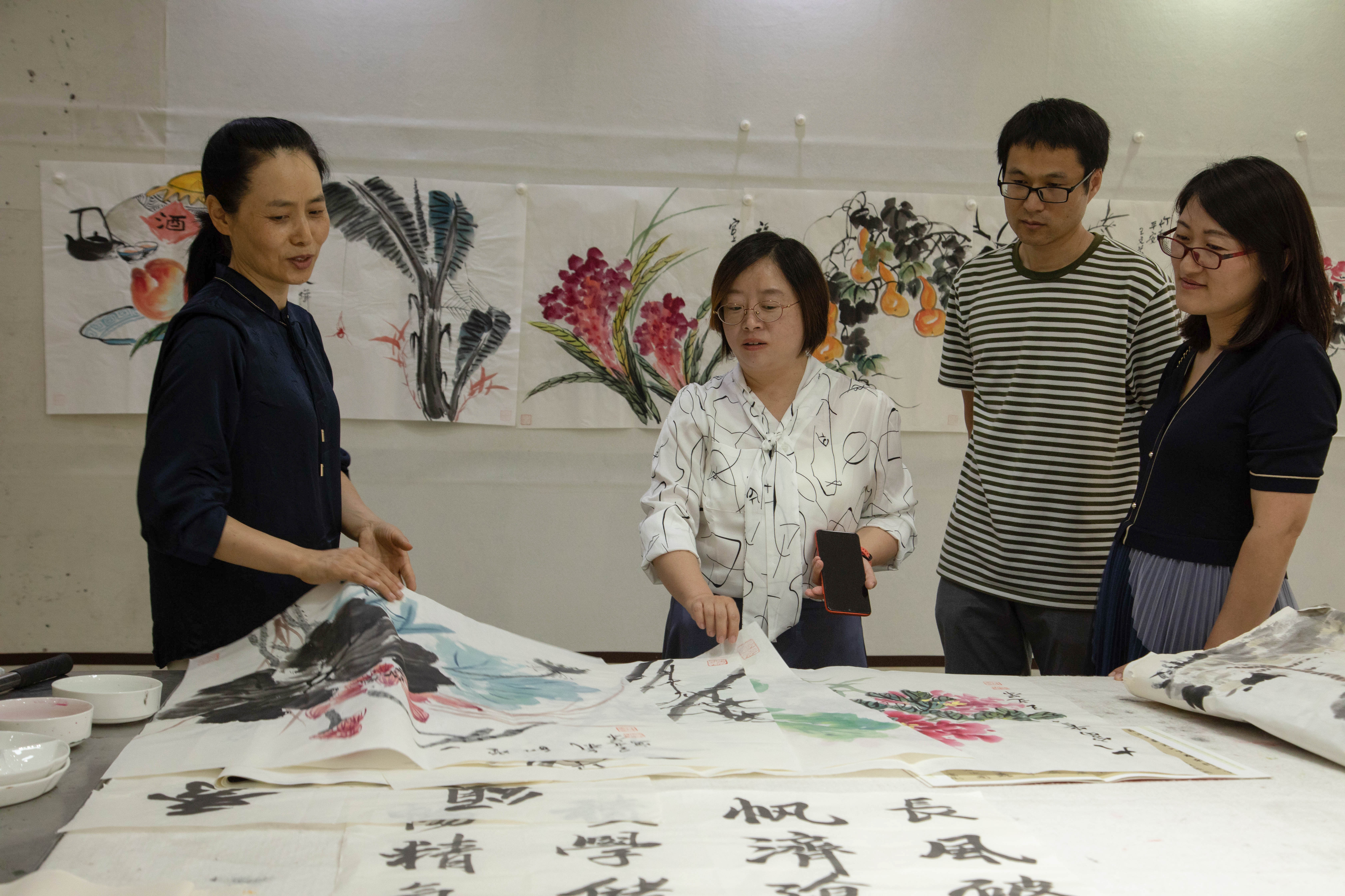 国家一级美术师、山东文华文化传媒有限公司董事长王文华接待了来访师生,带领大家参观了书画、剪纸等文化产品创作室。平台建设团队对不同艺术作品需要的纸张规格、纸品要求等做了调研。双方就校企深入合作开发相关文创产品、建设校外实训基地等事宜达成共识,双方还探讨了技艺传承与品牌推广相关课程的设计与实施。