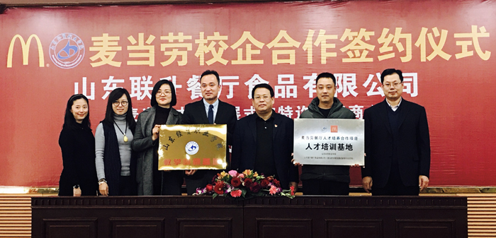 11月28日下午,我院与麦当劳山东联升餐厅食品有限公司在第二报告厅举行校企合作签约仪式。教务处处长王炳华,工商管理系党总支书记高巍,山东联升餐厅食品有限公司营运部总监江逵,人力资源部副总监吴林,人力资源部高级顾问宋云霞,营运部顾问常虹出席签约仪式。工商管理系学生辅导员和2018届毕业生参加了活动。