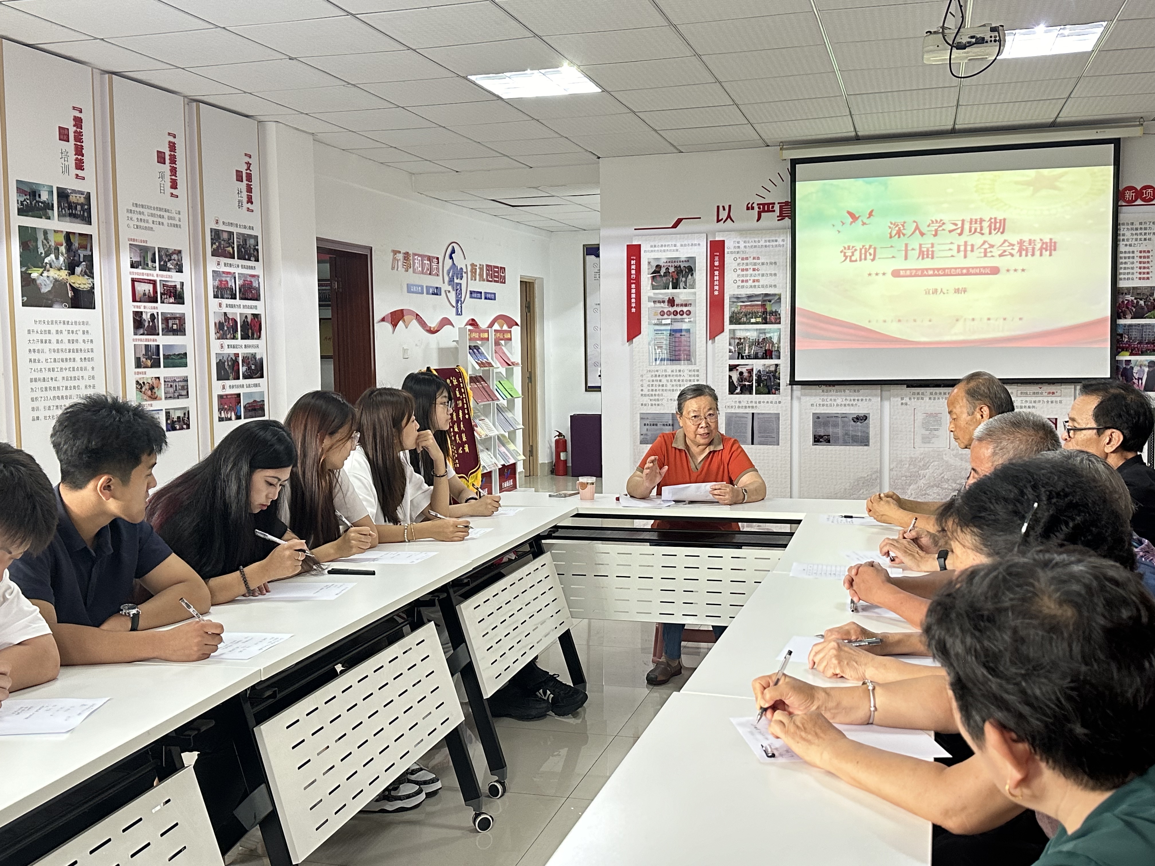 在社区刘萍老师的引领下,积极分子们有序地参观了社区中心陈列的党史展览,在将近两个小时的党课讲授过程中,刘萍老师给大家解读了党的二十届三中全会精神,并且通过讲述自己母亲的红色故事,使我们更深层次的理解艰苦朴素、勤俭节约、良好家教家风的重要意义。