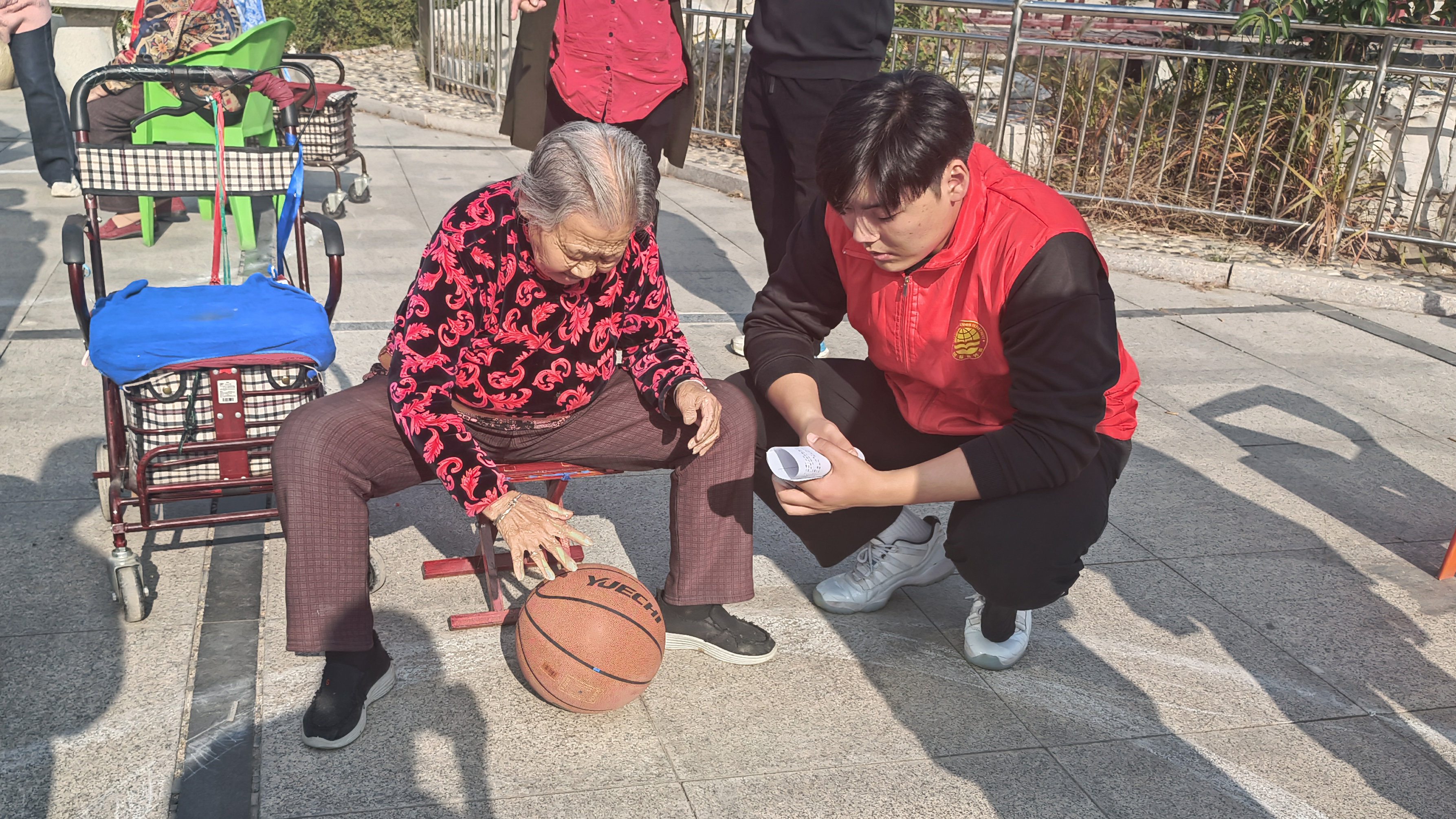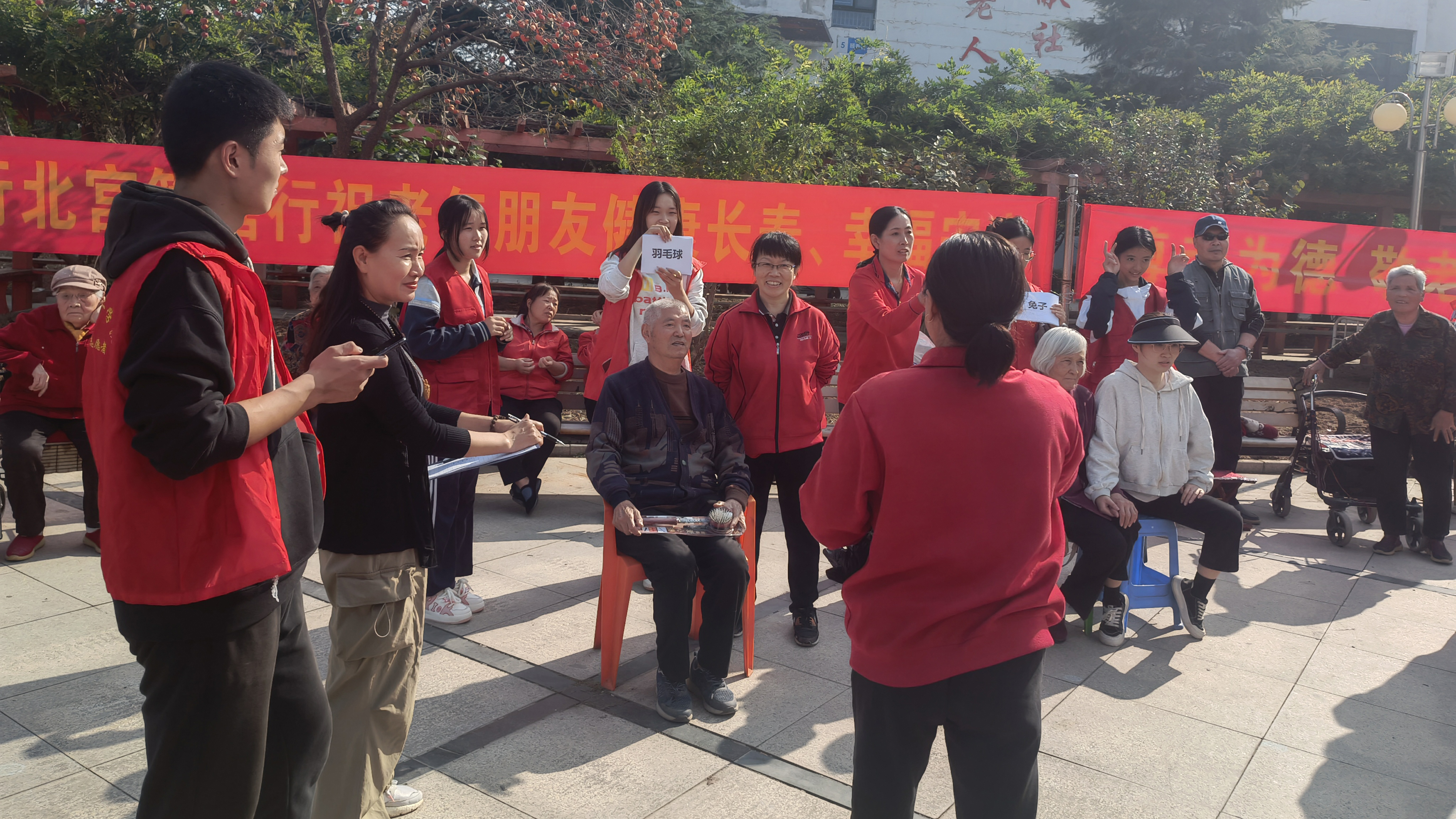 两支志愿者服务队为保障华都颐年园重阳节长者、员工趣味运动的顺利进行,早早到达中心,提前布置运动场,搬运器材,到公寓接送行动不便的老人,并负责维护现场秩序,担任裁判员等。