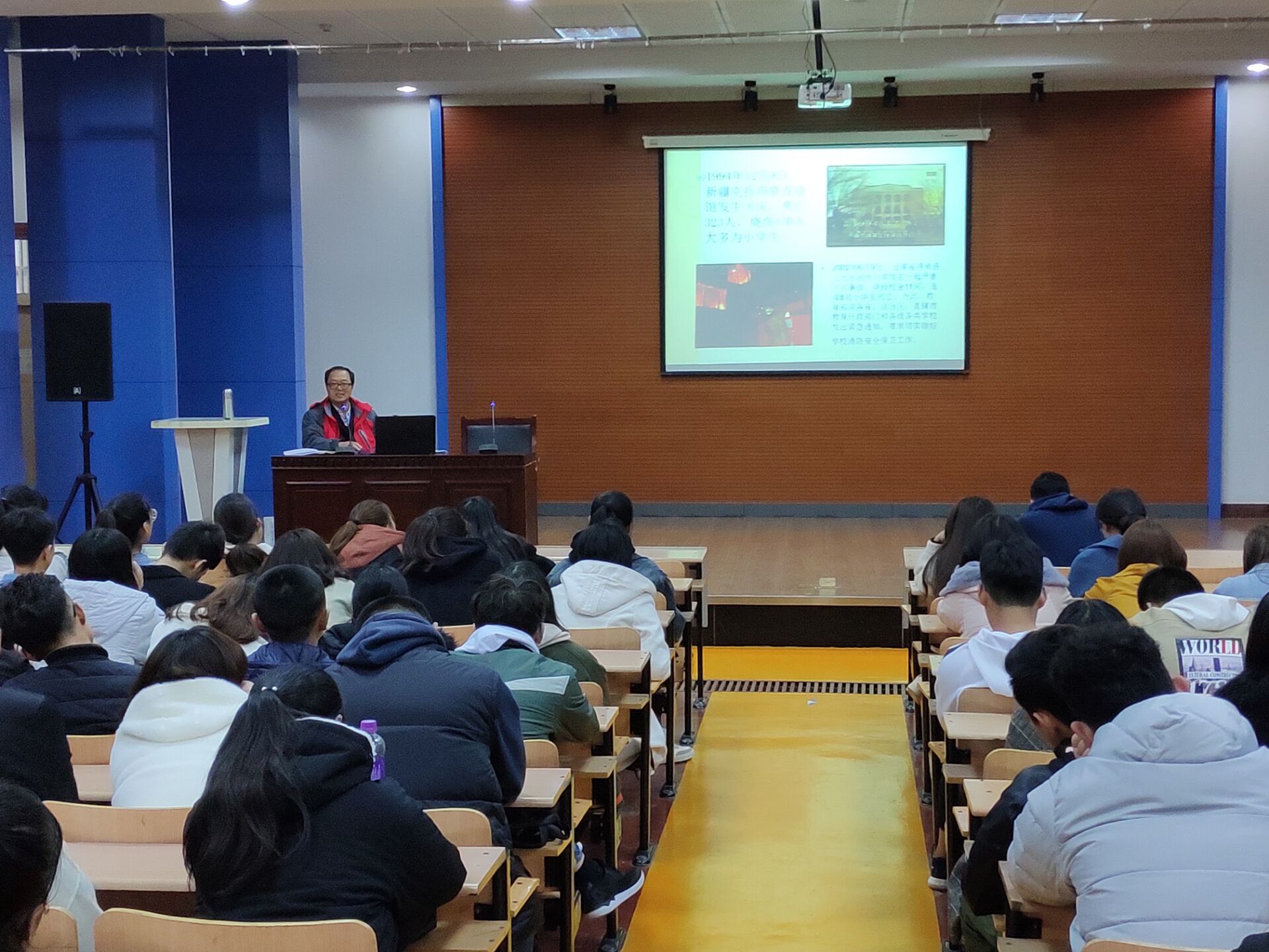 讲座上,杨亦文结合自身工作实践经验,通过案例分析,以图文并茂的形式,介绍了日常用火、用气、用电等方面的安全知识,重点讲解了火灾的类型、火灾的防范及灭火、自救等知识和技能。讲座结束后,保卫科工作人员带领全体同学组织了一次模拟火灾现场逃生实战演练。