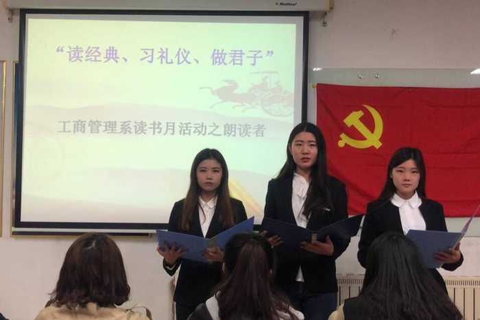 近日,工商管理系读者协会利用早自习晨读时间,组织开展了以“读经典,习礼仪,做君子”为主题的中华经典阅读活动。