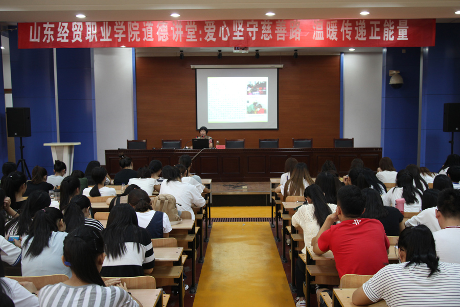 为进一步推动学院文明单位创建工作,充分发挥学院“道德讲堂”育人作用,引导广大师生投身道德实践,努力提升道德素质,积极培育和践行社会主义核心价值观,9月19日下午,学院邀请安丘市民政局副局长李国花做客学院道德讲堂,在第一报告厅为广大师生作了题为“爱心坚守慈善路,温暖传递正能量”的专题报告。工商管理系学生科长潘玉波主持了报告会。
