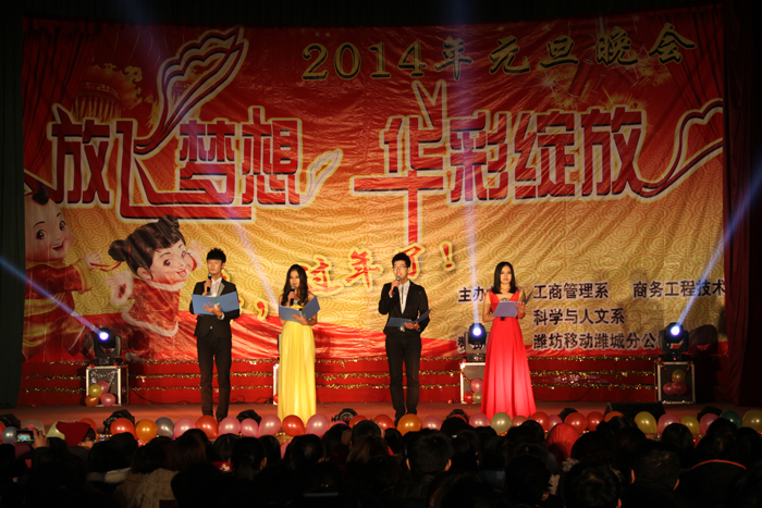 九州春色莺歌燕舞;四海征程虎跃龙腾。2013年12月19日晚由工商管理系、商务工程技术系、科学与人文系联合主办的2014年元旦晚会在大学生活动中心举行。科学与人文系党总支书记史桂英、工商管理系负责人李逾男、学生工作处副处长王学勇、财政金融系党总支副书记付俊花、商务工程技术系党总支副书记刘天英、工商管理系党总支副书记高巍、学生工作处代表孙彬、谭礼、李晓丹及主办方的全体辅导员莅临晚会现场与同学们共同观看了演出。