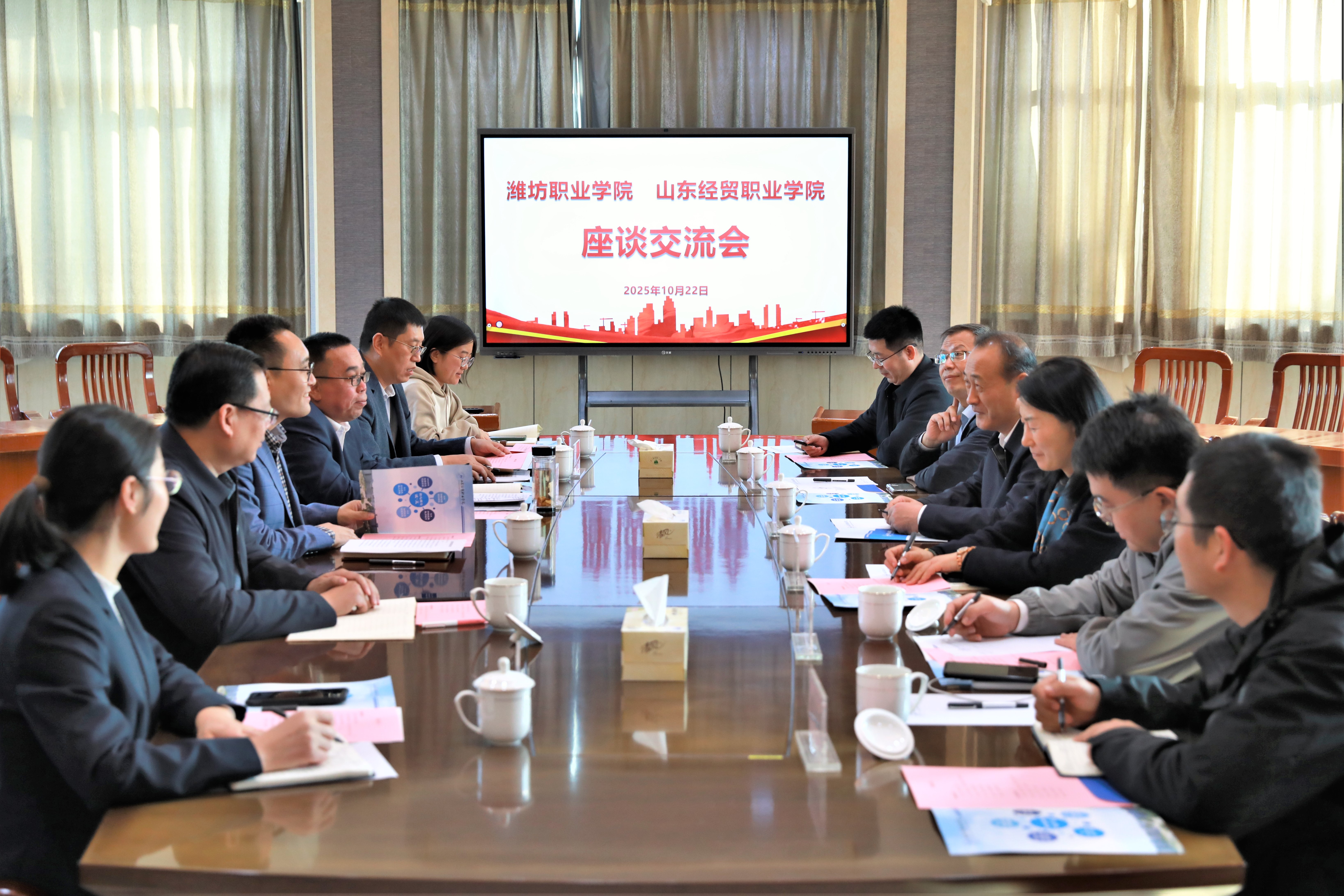 10月22日下午,潍坊职业学院党委委员、副院长赵宏坤,党委委员办公室(统战部)主任(部长)刘志艳一行六人到访学院。学院党委委员、副院长吕昌锋,党委委员、办公室主任陈志勇会见来访客人并座谈交流。