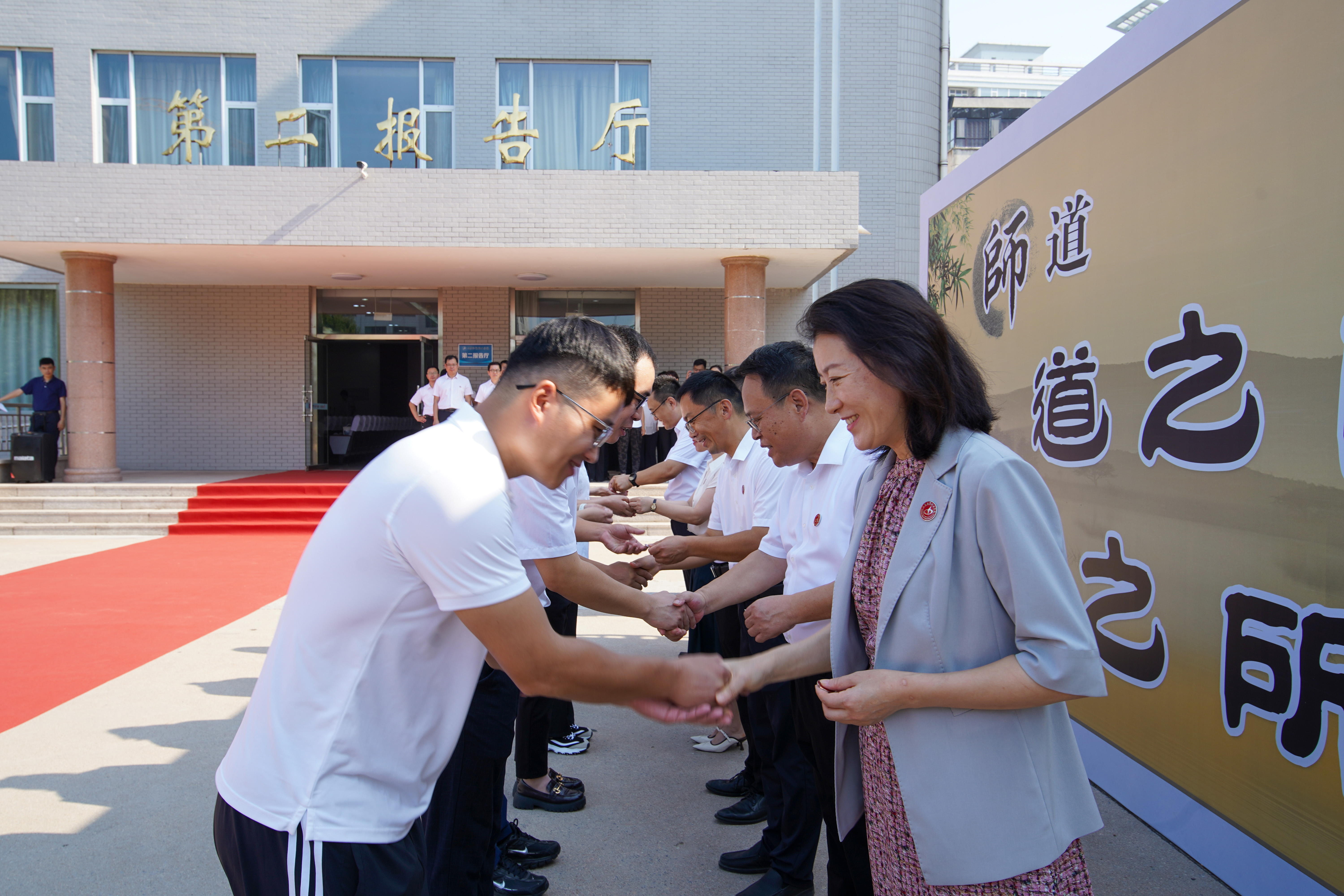 典礼上,新教师依次有序穿过“匠心之门”,实现从“学习者”或“工作者”到“育人者”的身份蜕变,学院领导为新教师颁发了校徽。随后,全体与会人员高声齐唱校歌,以饱满的热情和昂扬的姿态传承经贸血脉。在学院党委委员、副院长吕昌锋的领誓下,全员高举右拳,以教育者的名义庄严宣誓,在铿锵誓言中感悟使命与责任。