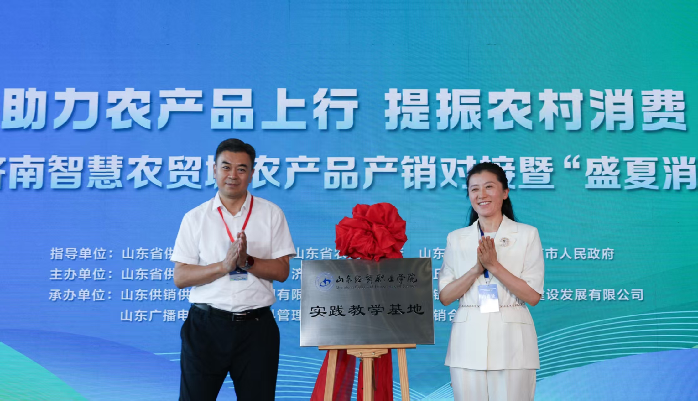 6月28日上午,随着山东供销济南智慧农贸城农产品产销对接暨“盛夏消费季”活动的正式启动,山东经贸职业学院实践教学基地正式落户山东供销“一站式”农贸综合体——济南智慧农贸城。济南市章丘区委书记马志勇和山东经贸职业学院党委书记高志秀共同为基地揭牌。