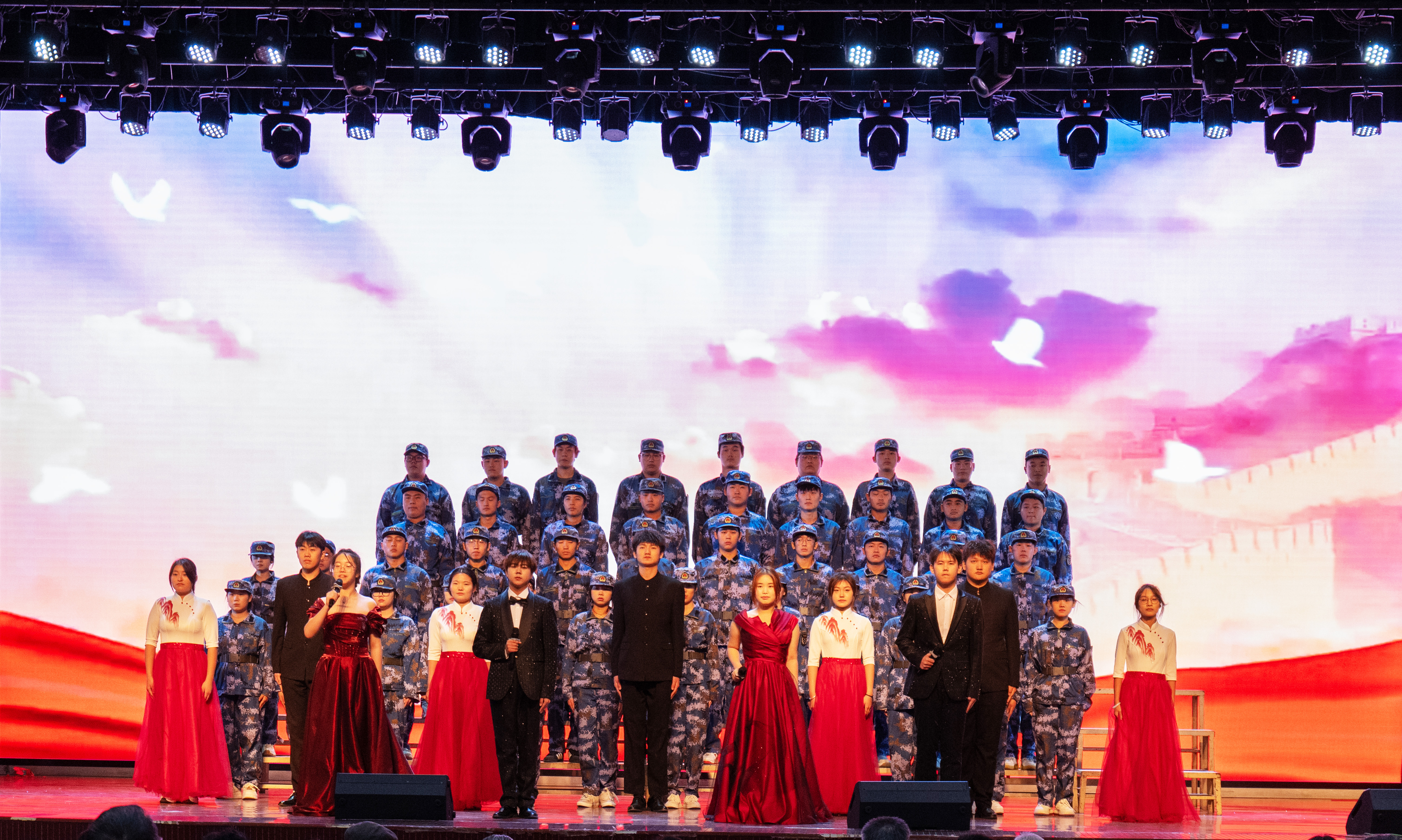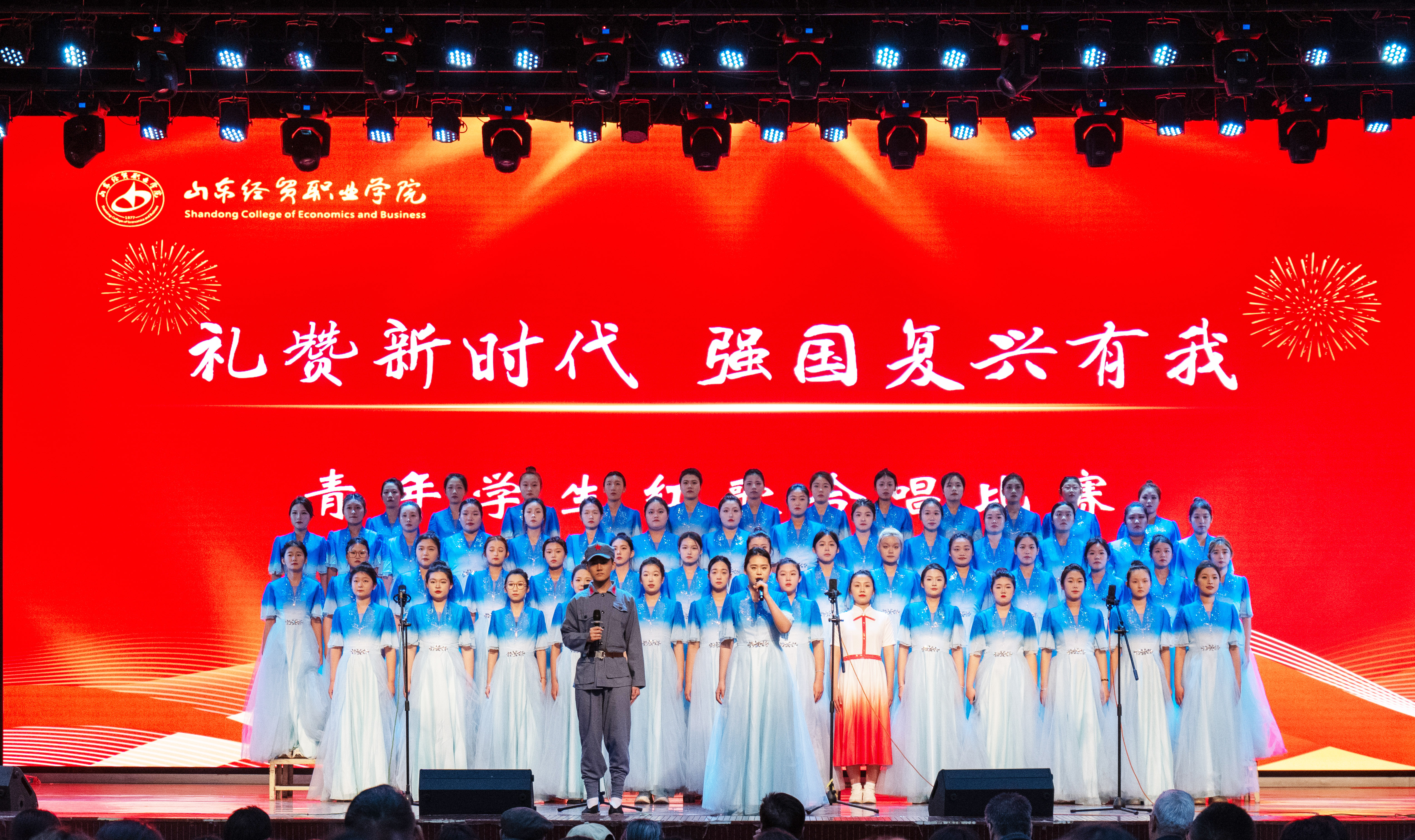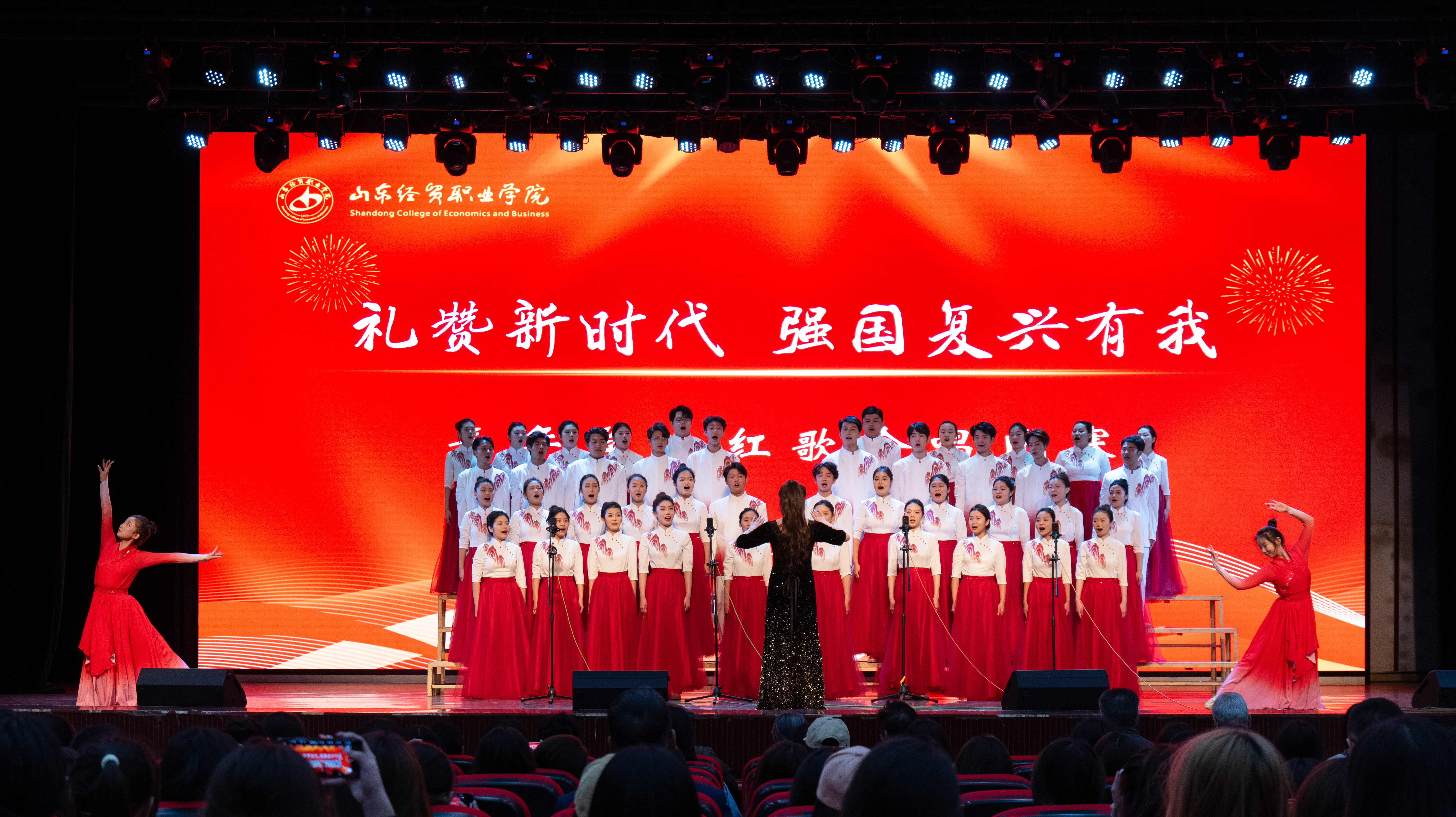 比赛现场高潮迭起,掌声雷动。工商管理系以《青春中国》《万疆》拉开了比赛序幕,财政金融系的《中华少年》《当那一天来临》紧随其后,信息技术系的《锦绣》《祖国不会忘记》、会计系的《青春中国》《没有共产党就没有新中国》、商务工程技术系的《百年芳华》(节选)《强军战歌》,以及国际商务系的《红铁》《错位时空》等节目轮番上演,赢得了在场观众的阵阵喝彩。