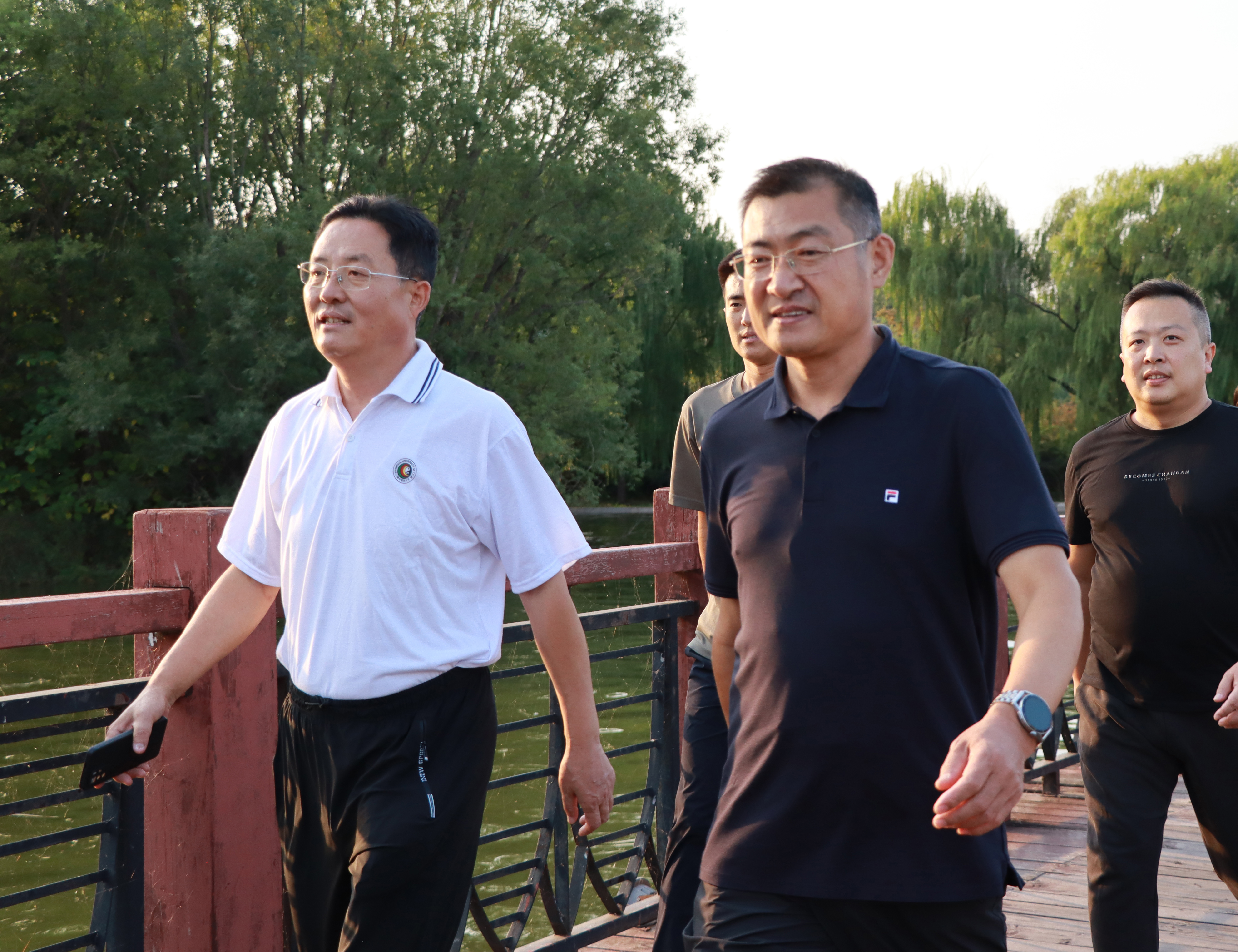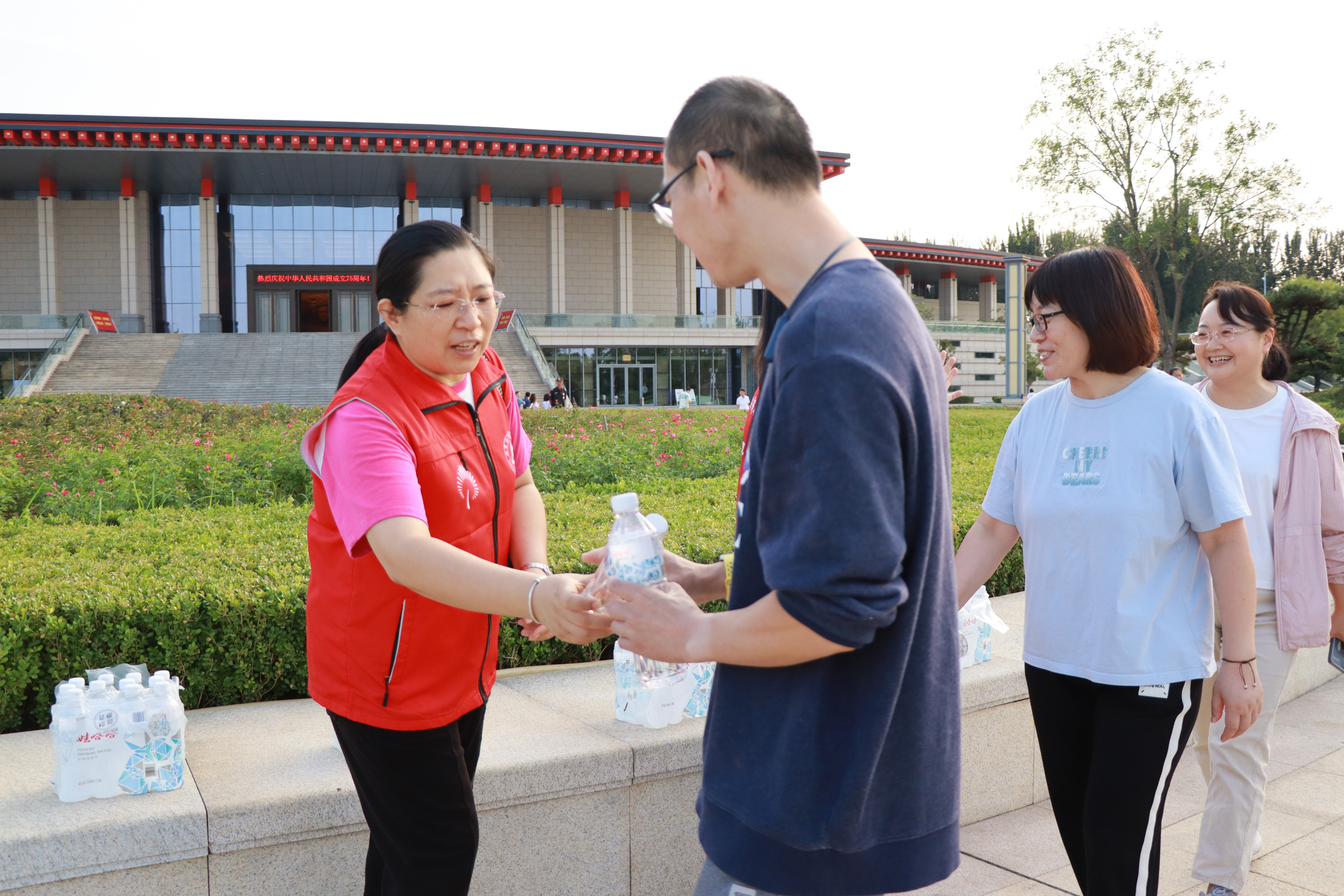 鸢都湖畔,微风轻拂,景色宜人。教职工们精神抖擞,步伐矫健,一路你追我赶,欢声笑语,很快到达活动半程补给站——潍坊市党史教育馆。志愿者们为大家准备了矿泉水,短暂停留之后,队伍继续向鸢都湖东岸迈进,最终抵达本次活动终点站——世纪风帆。