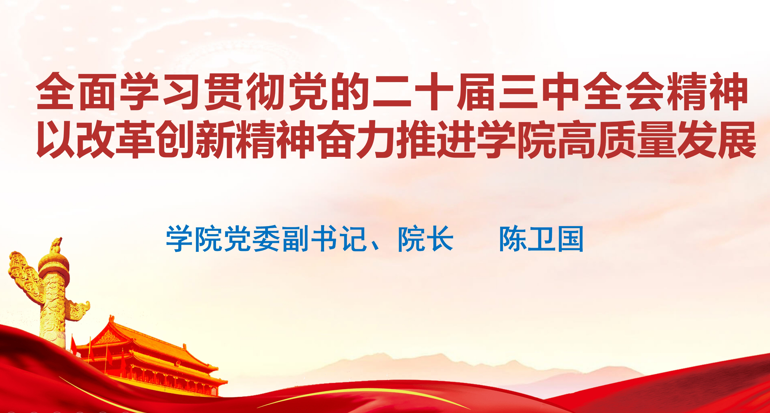陈卫国从党的二十届三中全会的重大意义和主题、深入学习领会习近平总书记关于全面深化改革的重要论述、进一步全面深化改革的总体思路和重点方面、学用结合推动学院高质量发展等方面对二十届三中全会精神进行了系统解读,对学院教育综合改革和高质量发展进行了安排部署。