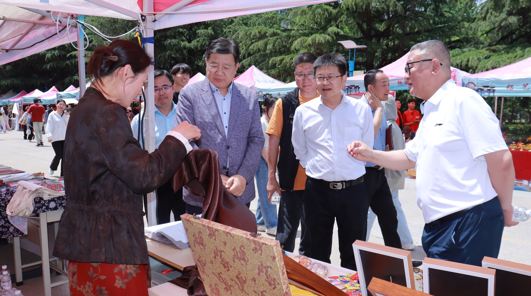 传承千年文脉,共享中华文明。5月16日上午,由山东经贸职业学院、潍坊市非物质文化遗产保护协会联合举办,学生工作处(团委)承办的“匠心筑梦·非遗进校园”活动在学院诚正路盛大开幕。此次活动共邀请到50余名国家、省、市级非遗传承人,涉及潍坊风筝、潍县布玩具、核雕、皮艺、织染、蛋雕、面塑等35个项目。学院党委副书记、院长陈卫国,潍坊市非物质文化遗产保护协会副会长孙海东,学院副院长张强,各职能部门、各系主要领导干部参加活动。