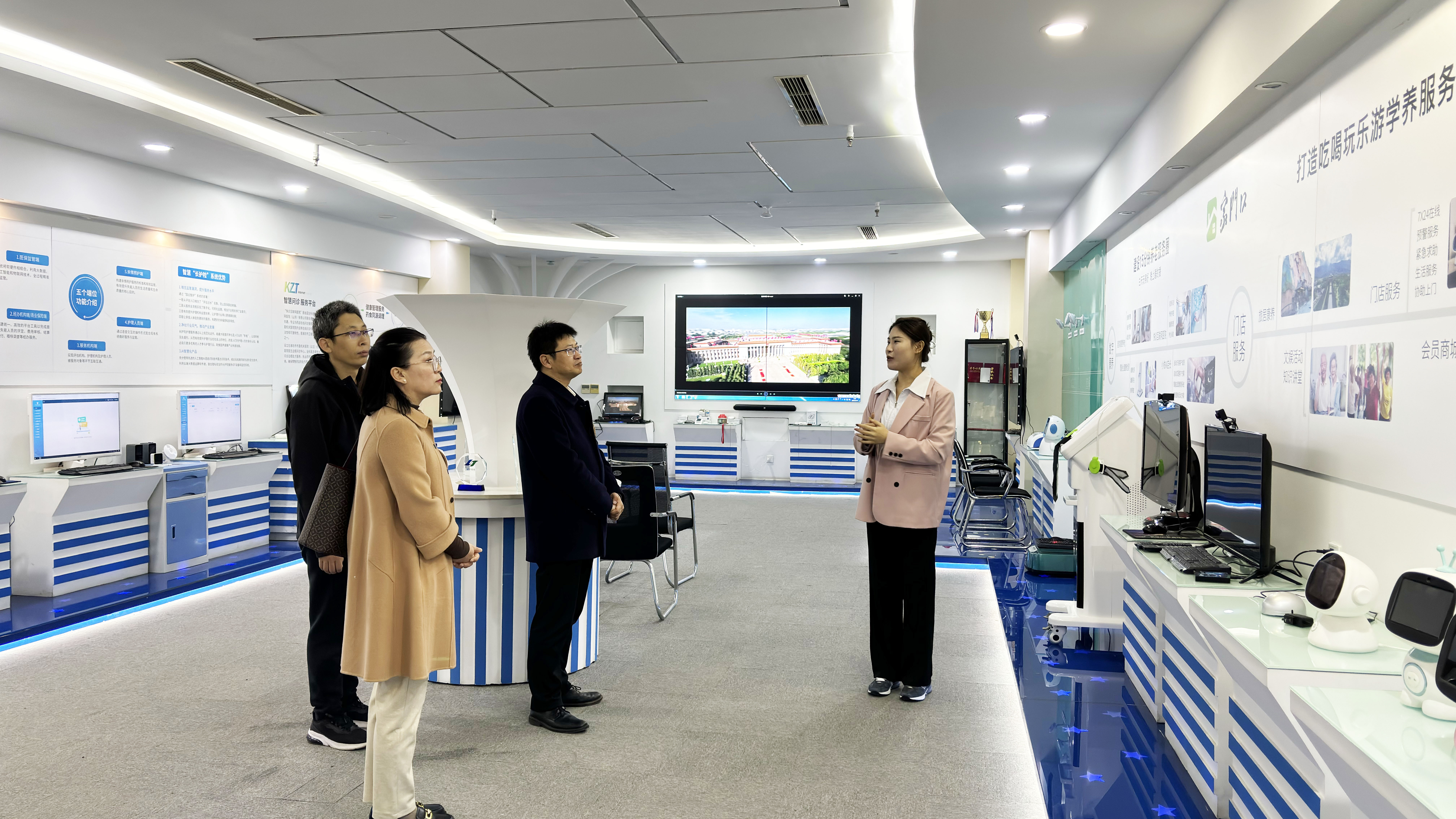 我院一行参观考察了蓝创科技展厅、智慧康养服务平台、长护险智慧服务平台,体验了“家门口”系列智慧医养产品。