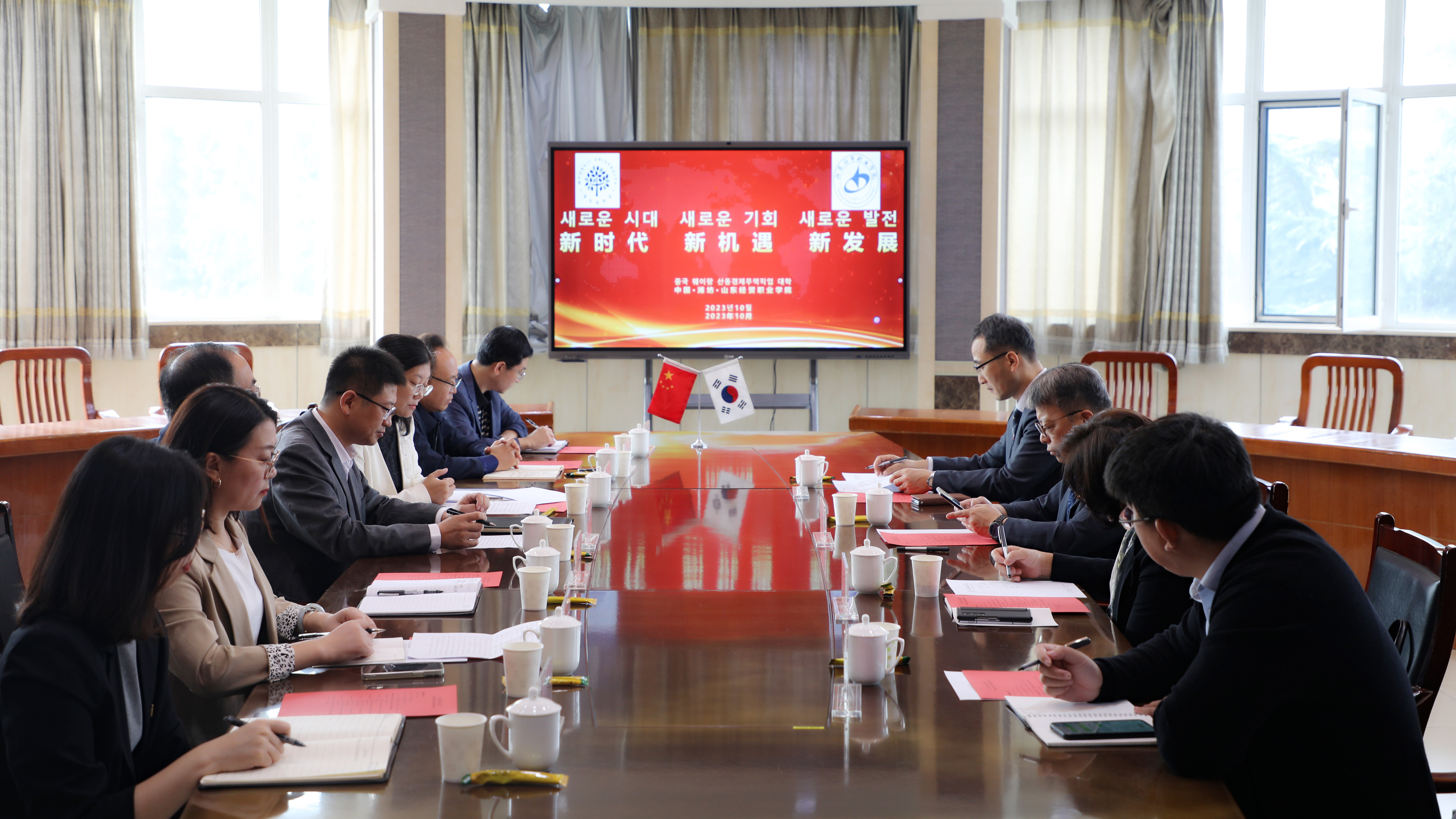 张强代表学院对尹鐘彬一行的来访表示热烈欢迎,并向客人介绍了学院基本办学情况,办学特色,以及国际交流合作情况,特别是与韩国相关高校的合作与交流。尹鐘彬介绍了明知大学的基本情况,同时希望通过此次访问,加强两校间的合作。之后,双方就建立友好合作关系,开展学生短期研学、学生学历提升、教师博士培养等项目开展进行了深入交流,并达成了初步合作意向。交流结束后,双方签署了《中国山东经贸职业学院和韩国明知大学间友好合作及学术交流协议书》。