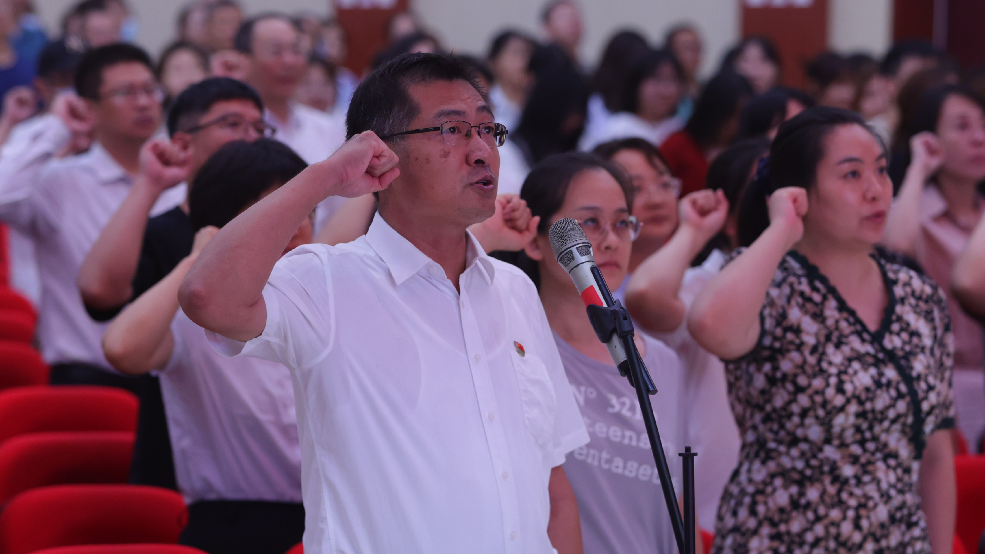 会议最后,陈卫国带领全体教师重温教师誓词,进一步激发广大教师的责任感和使命感。与会人员共唱校歌,彰显“诚·正”核心理念,涵养爱校荣校主人翁意识,激扬干事创业精气神。