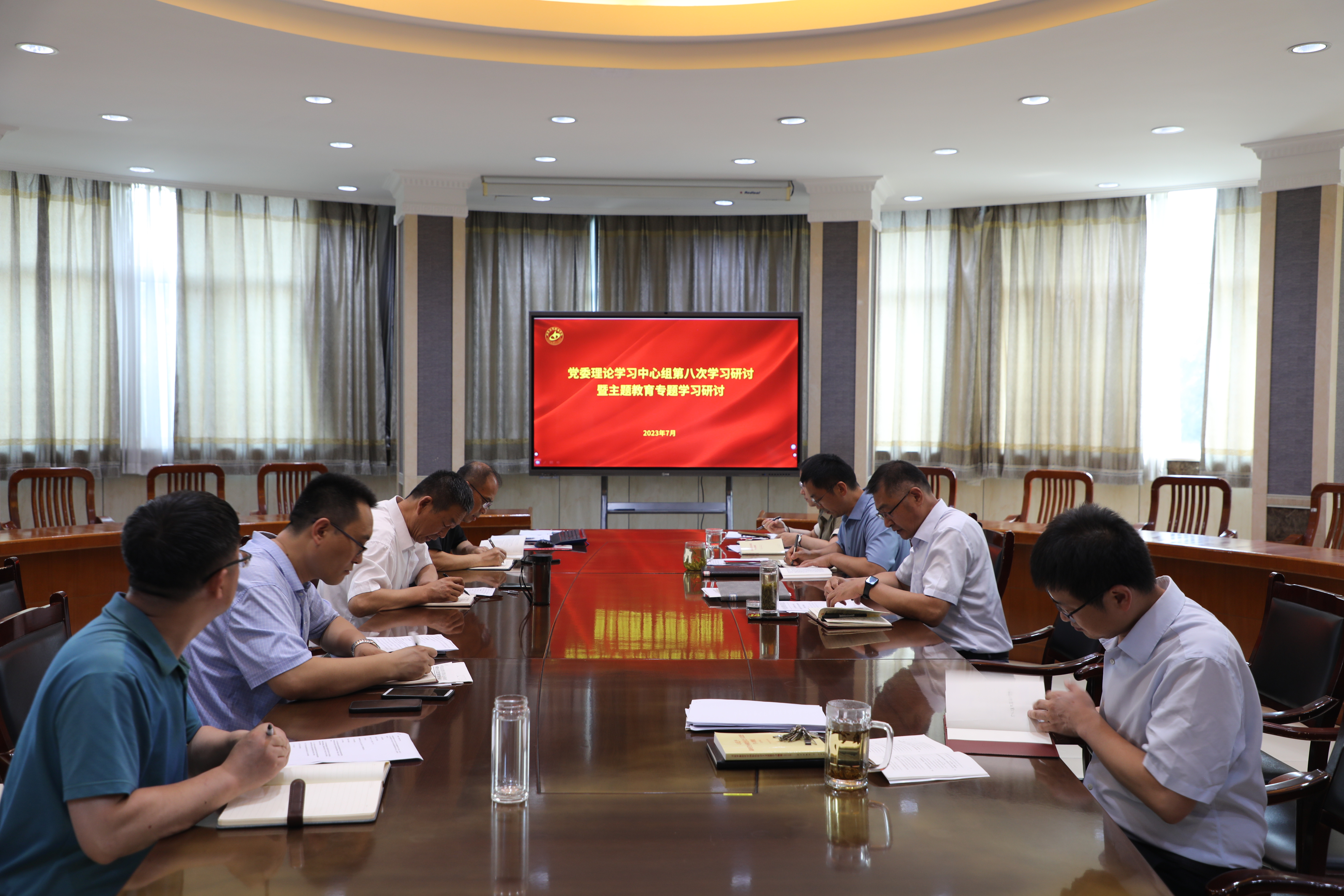 7月15日,党委理论学习中心组八次学习研讨暨主题教育专题学习研讨会议在圆厅会议室举行。学院党委副书记、院长陈卫国主持会议。