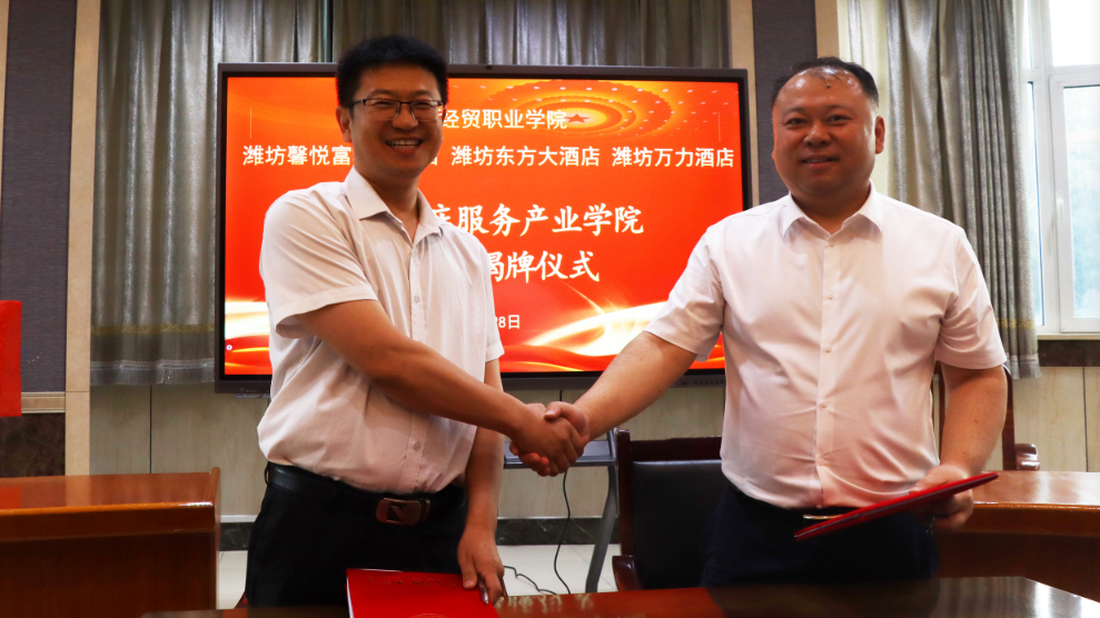 会上,张强、王庆国、李雪莲、王玲玲分别代表校企共同签署共建酒店服务产业学院协议书,并为产业学院揭牌。