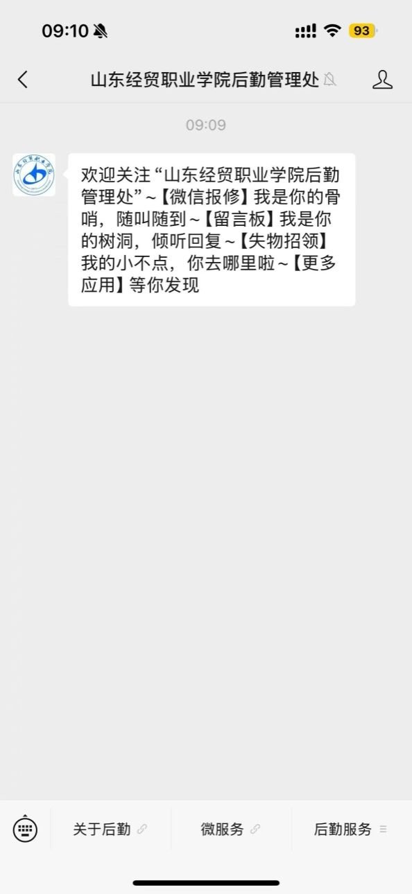 1.报修人微信搜索公众号“山东经贸职业学院后勤管理处”或者“sdjmxyhqglc”,点击“关注服务号”,即可进入公众号主界面。