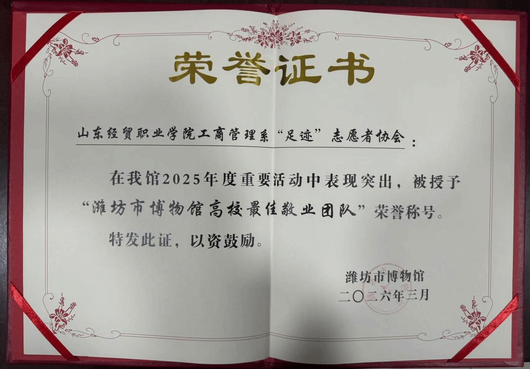 近日,在潍坊市博物馆2025年度志愿者表彰大会上,学院工商管理系“足迹”志愿者协会凭借在年度系列重要文博活动中的突出表现,被授予“潍坊市博物馆高校最佳敬业团队”荣誉称号。