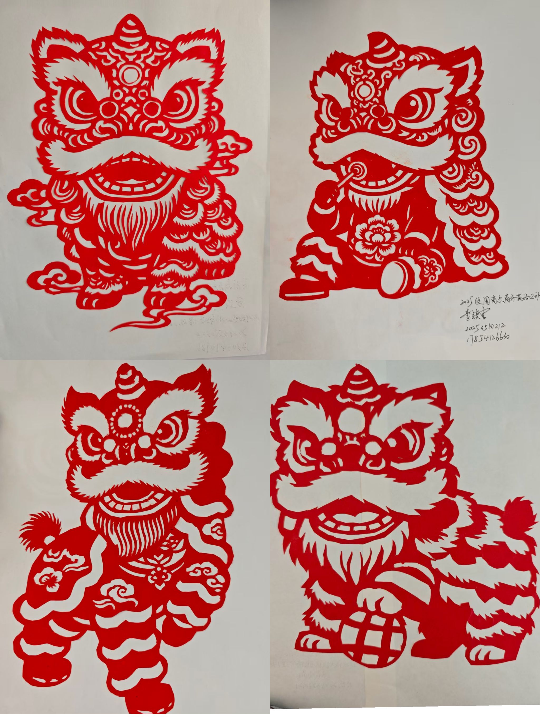 活动中,同学们以剪刀为笔、红纸为卷,将威武灵动的醒狮形象融入剪纸技艺,以巧手匠心勾勒狮韵,以方寸红纸承载非遗底蕴,生动诠释“醒狮迎春、非遗传承”的文化内涵。2025级大数据与会计1班韩沂臻同学的作品以双狮为核心,构图对称工整、精巧雅致。狮鬃层叠卷曲、眉眼灵动传神,辅以绣球、铜钱等吉祥纹样环绕,完美契合醒狮纳福迎祥、事事如意的美好寓意。繁复细腻的镂空剪纸工艺,更让作品气韵生动、喜庆热烈;2025级商务英语2班周爽同学的作品以单狮跃动为造型,线条流畅利落,狮鬃层次分明、神态威风凛凛,尽显“醒狮迎春、生机盎然”的活动意趣。