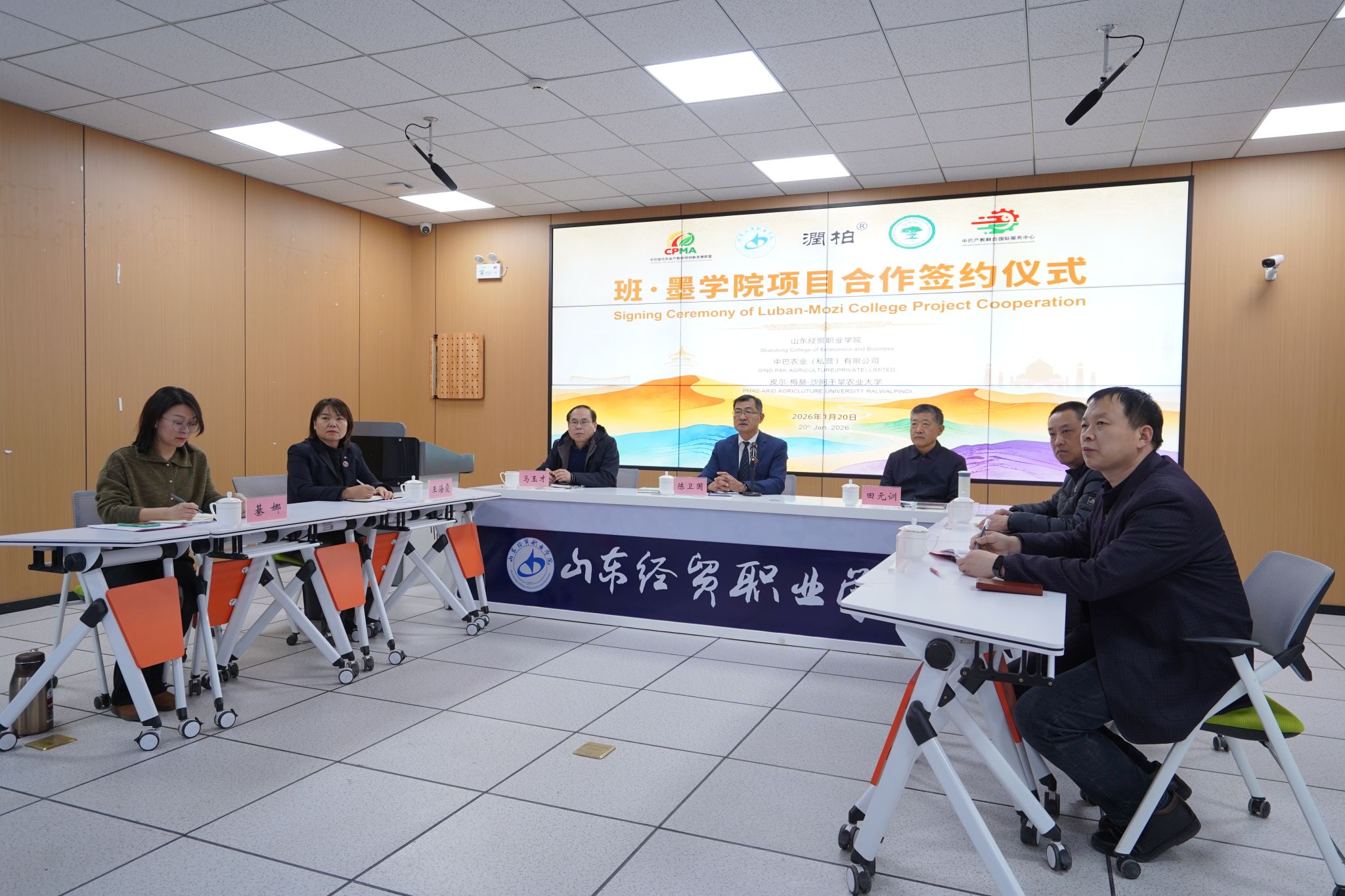 1月20日,由山东经贸职业学院、中巴农业(私营)有限公司与皮尔·梅赫·沙阿干旱农业大学联合发起的巴基斯坦“班·墨学院”框架协议签约仪式举行。皮尔·梅赫沙阿干旱农业大学副校长卡马尔-乌兹-扎曼和相关领导,中巴农业(私营)有限公司董事长张明君,潍坊市现代产教融合研究院、潍坊市产教融合研究院相关领导,学院党委副书记、院长陈卫国,相关部门负责人等30余人参加活动。