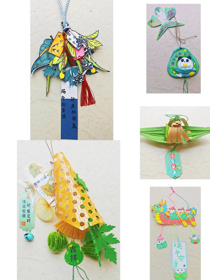 本次“端午制吉挂,祈愿纳安康”挂件手工制作活动中,同学们以巧思为笔,传统为墨,于挂件之上绘就端午民俗画卷与美好祈愿。粽叶、香囊等元素通过精心塑造,鲜活呈现。非遗绳结技艺穿插其中。这不仅是手工创作,更是端午文化的创新传承。