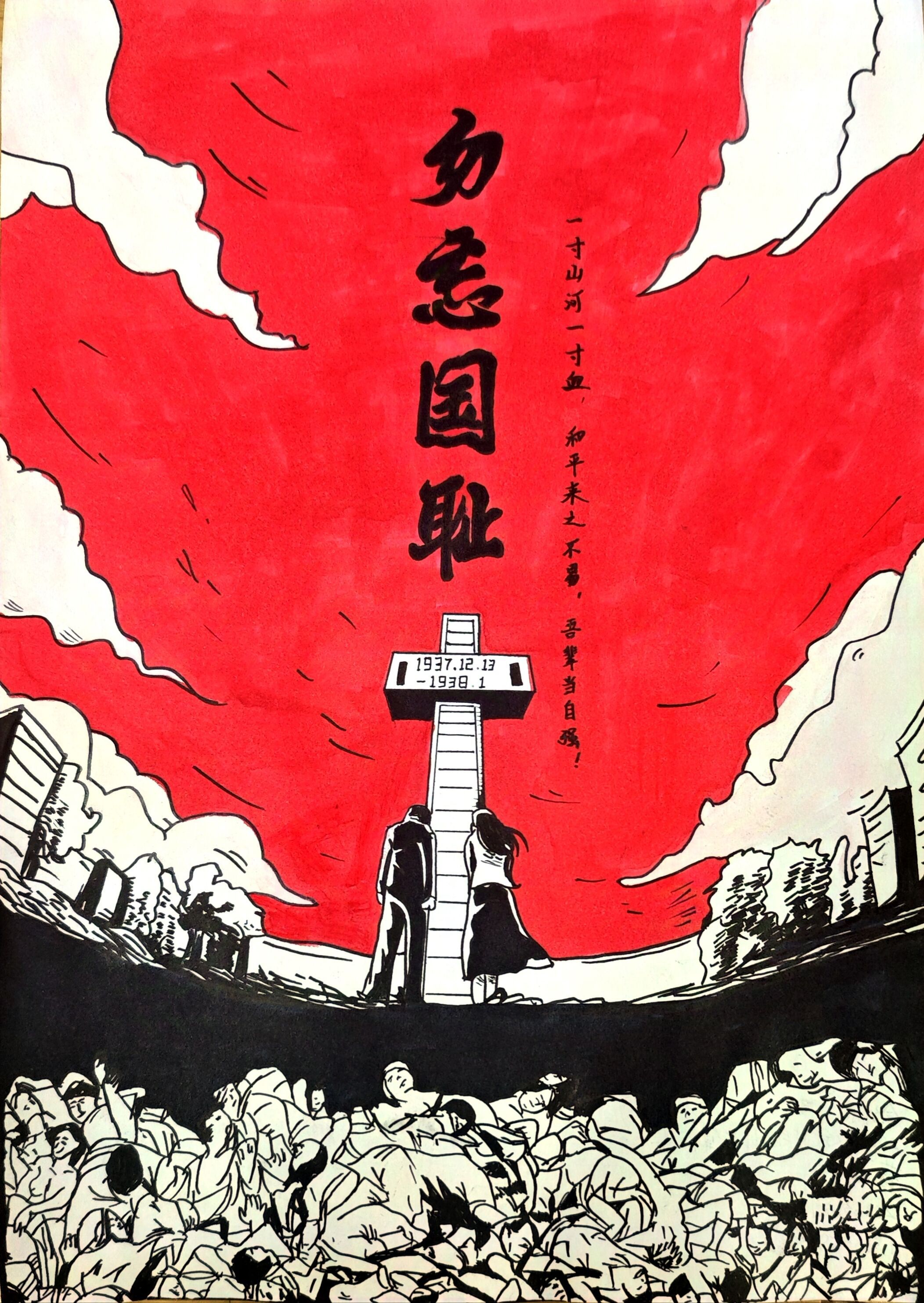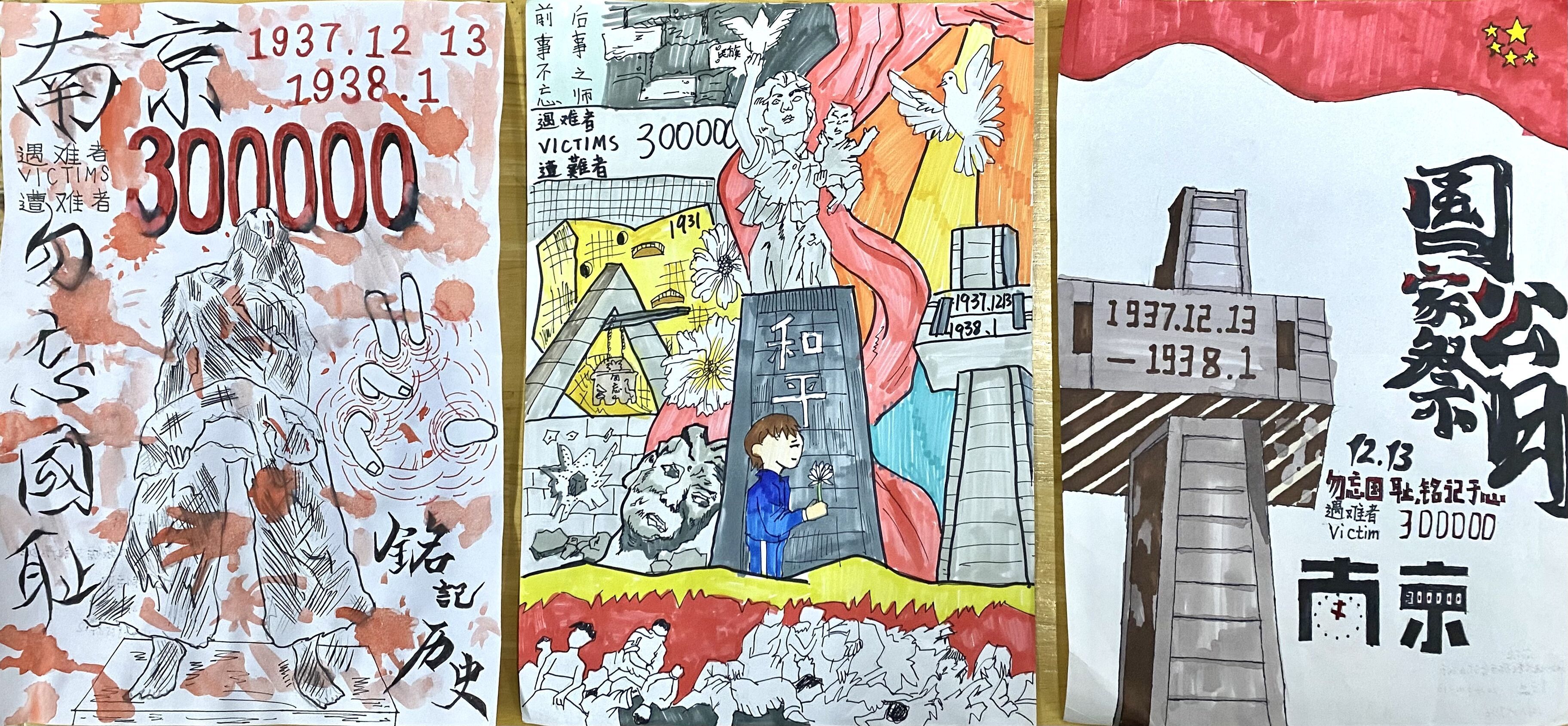 “国行公祭,法立典章。铸兹宝鼎,祀我国殇。”国家公祭日是对民族苦难的沉痛追思,是国家记忆的深刻烙印,是维护和平的庄严昭告。活动中,同学们拿起画笔,用自己的方式表达对历史的铭记和对和平的向往。一幅幅画作中,有的再现了南京大屠杀的凄惨场景,那触目惊心的画面让人久久难以平复心情;有的则描绘了如今和平年代的美好生活,阳光、鲜花与孩子们的笑脸形成了鲜明的对比。这些画作不仅是同学们艺术才华的展现,更是他们内心对历史与和平深刻感悟的抒发。