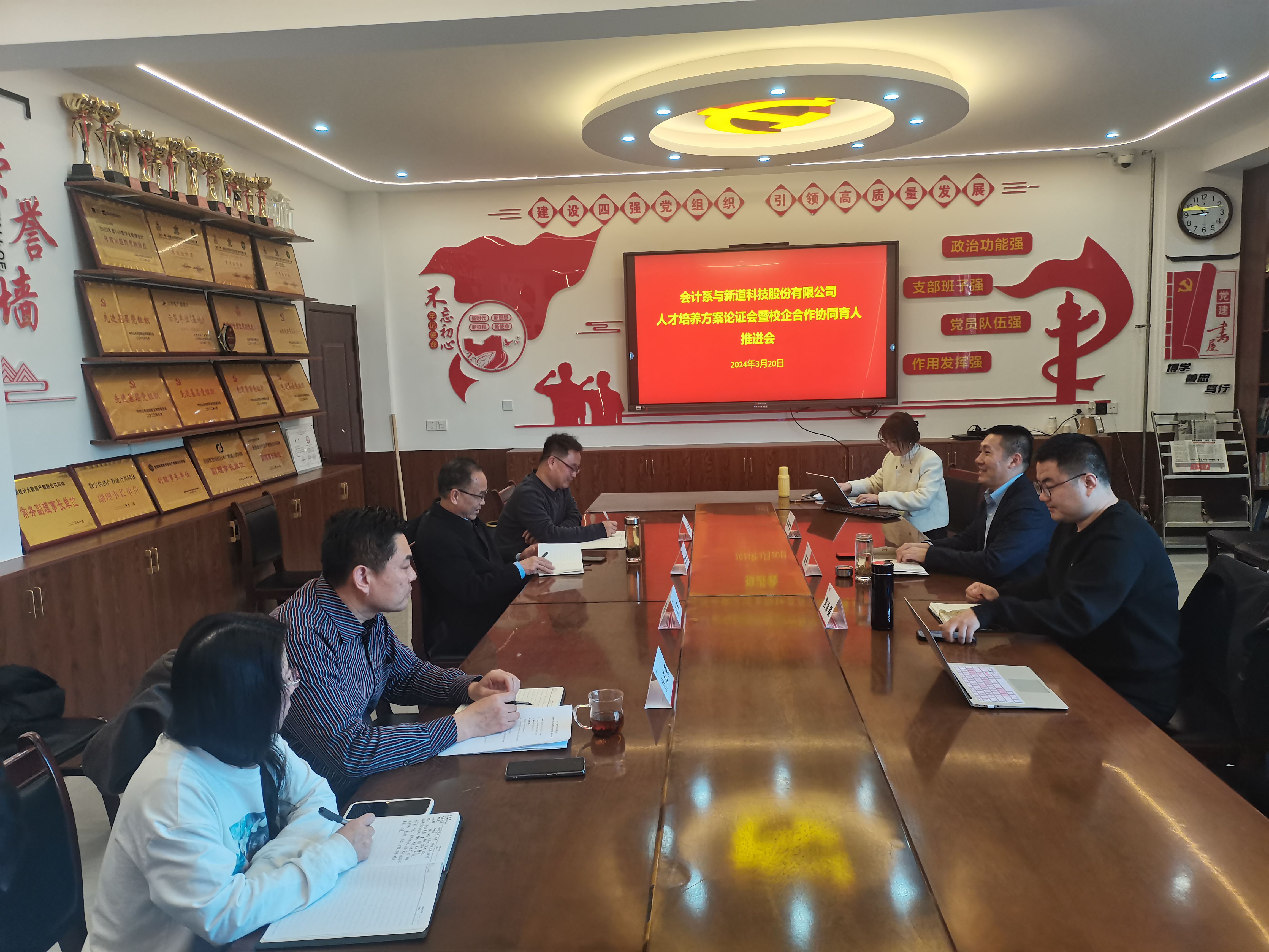 双方就前期校企合作过程中取得的成绩、面临的新问题以及下一步工作思路等进行交流探讨。重点围绕新道智能会计学院建设、2022级校企合作班下学期学生实习工作安排、2023级校企合作班学生游学等事宜进行了研讨。就校企合作班人才培养方案及人才培养路径进行了针对性讨论,双方一致认为要从数智化背景出发,以培养数智化财务人才为抓手,修订新版人才培养方案。