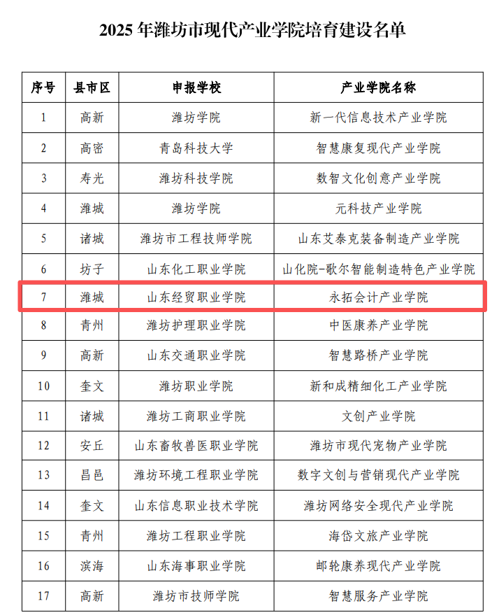 近日,潍坊市现代产业学院建设工作专班公布了2025年潍坊市现代产业学院培育建设名单,学院永拓会计产业学院成功入选。
