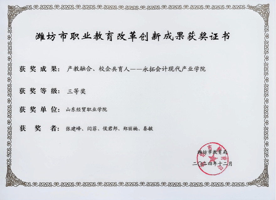山东经贸职业学院智能会计“秦学昌技能大师”工作室由山东省首批泰山产业领军人才、山东省高校产业教授秦学昌领头组建,我院与永拓会计师事务所(特殊普通合伙)山东分所共同建设管理,并于2023年8月被山东省教育厅批准立项为山东省“秦学昌技能大师”工作室。2024年被山东省教育厅评为建设成效较好工作室。