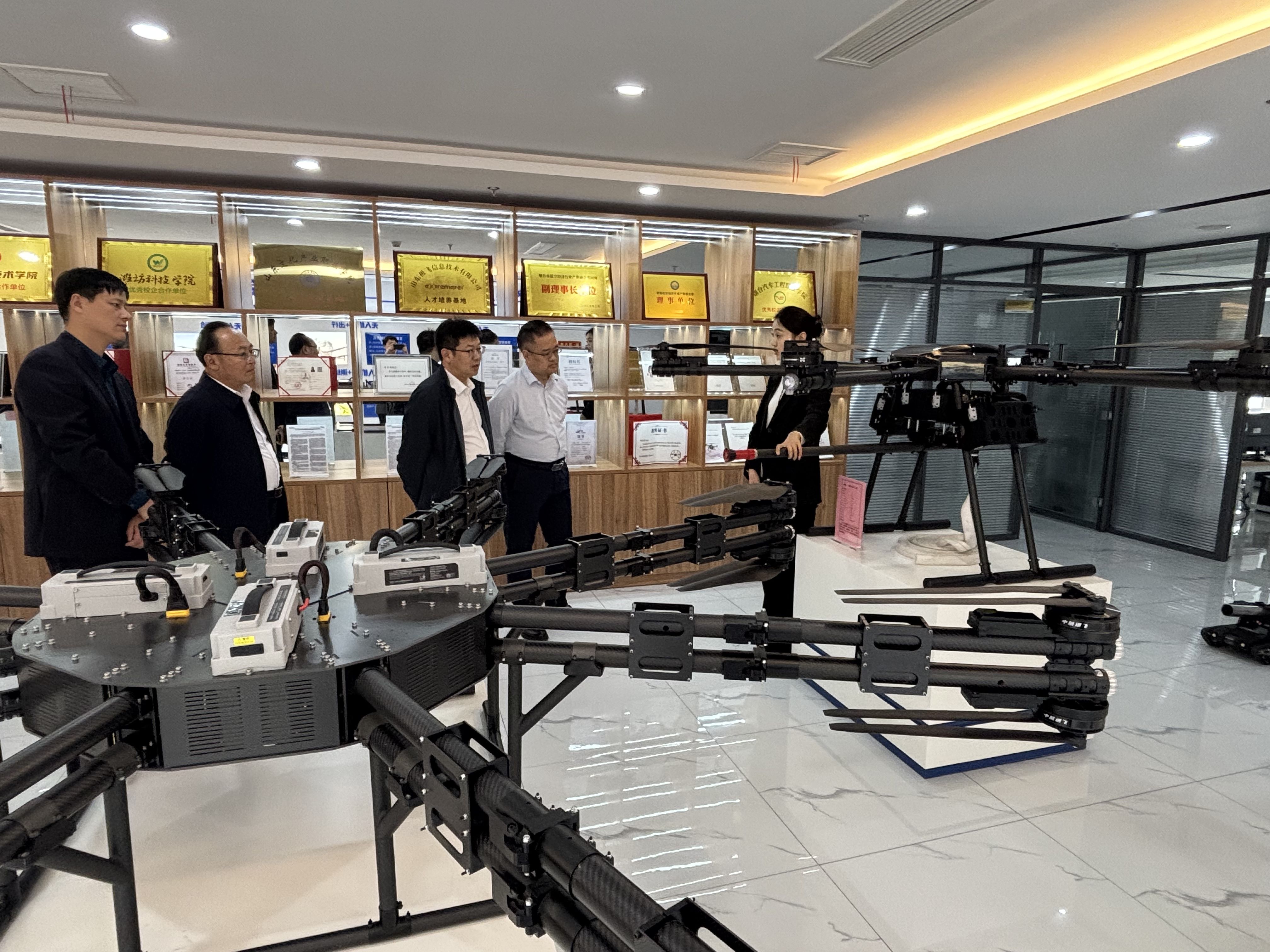 中航通飞(山东)集团董事长李吉安、技术总监张博学、培训事业部总经理王海员等陪同考察了党建中心、无人机型号陈列室、模拟飞行室、培训中心等,全面介绍了中航通飞(山东)集团的无人机产品线、实训合作学校、生产组装基地、研发中心、自研案例教材及“技能兴鲁”职业技能大赛等业务。
