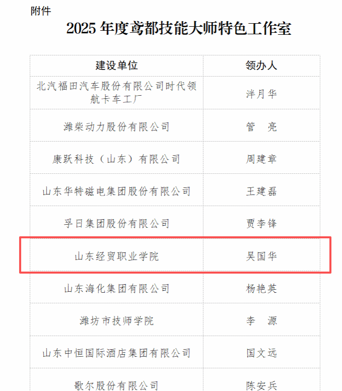 近日,潍坊市人力资源和社会保障局公布了2025年度“潍坊市突出贡献技师”人选名单及“鸢都技能大师特色工作室”建设单位。在全市范围内,共有60名高技能人才入选突出贡献技师,10家单位被确定为2025年度鸢都技能大师特色工作室建设单位。我院在本次评选中表现突出,成为全市高校中唯一同时获批两项荣誉的院校。学院申报的“鸢都技能大师特色工作室”以物流服务师为职业(工种),由吴国华教授担任领办人。该工作室依托学院重点建设和特色发展的山东省高水平专业群—...