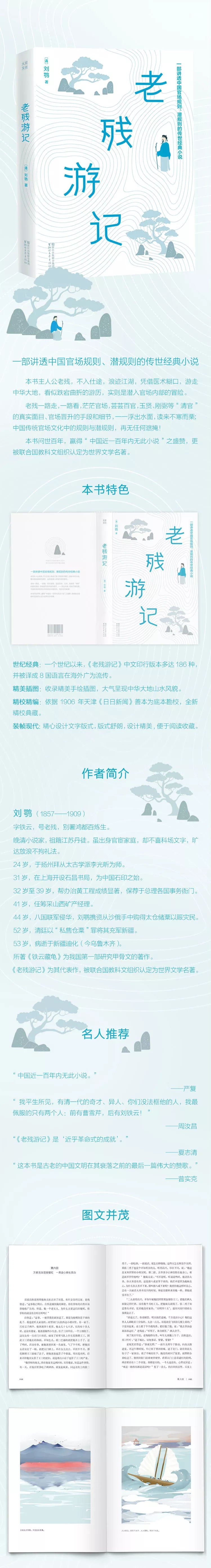 世纪经典:一个世纪以来,《老残游记》中文印行版本多达186种,并被译成8国语言在海外广为流传。