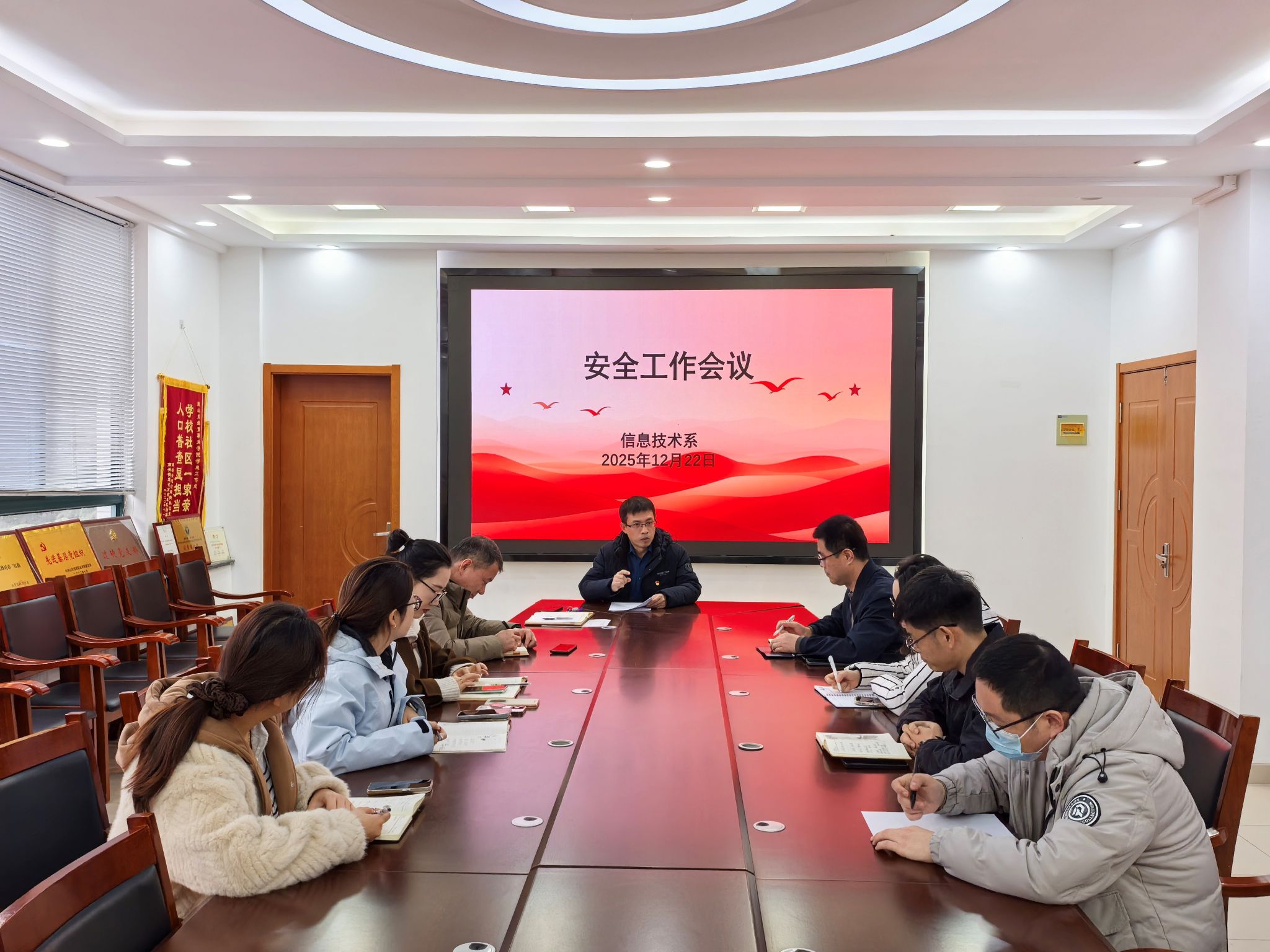 压实安全责任。12月22日,信息技术系党总支书记杨忠军主持召开学生安全工作部署会,全体辅导员参会。会议深入学习贯彻习近平总书记关于安全生产的重要论述,传达了学院《关于进一步加强学生安全教育与健康教育工作的通知》要求,结合学院近期安全案例和系部实际制定了《期末安全工作实施方案》,构建了书记负总责、辅导员抓班级、学生干部盯宿舍的三级系部安全责任体系,明确了消防安全、用电安全、交通安全、防溺水以及心理健康等多项工作任务,并分解到人,建立了巡查通报机制,实现安全责任层层传递。